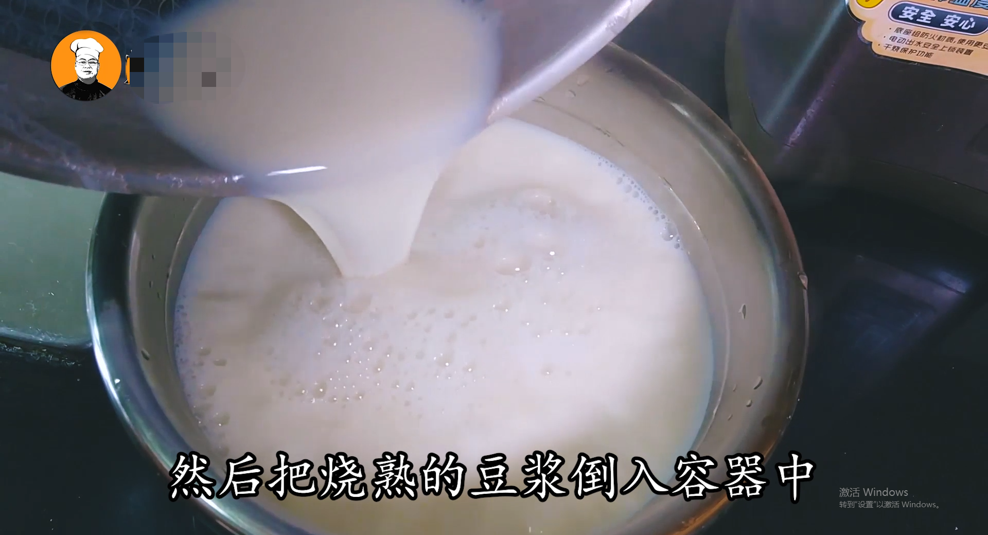 6、再把4克內脂放入適量冷開水中攪勻,然后把燒熟的豆漿倒入容器中,再倒入內脂水迅速攪勻,然后靜置十分鐘左右,豆漿就變成豆腐腦了