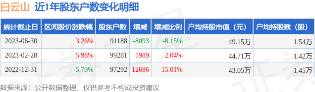從股價來看,2023年2月28日至2023年6月30日,白云山區間漲幅為3.26%,在此期間股東戶數減少8093.0戶,減幅為8.15%。