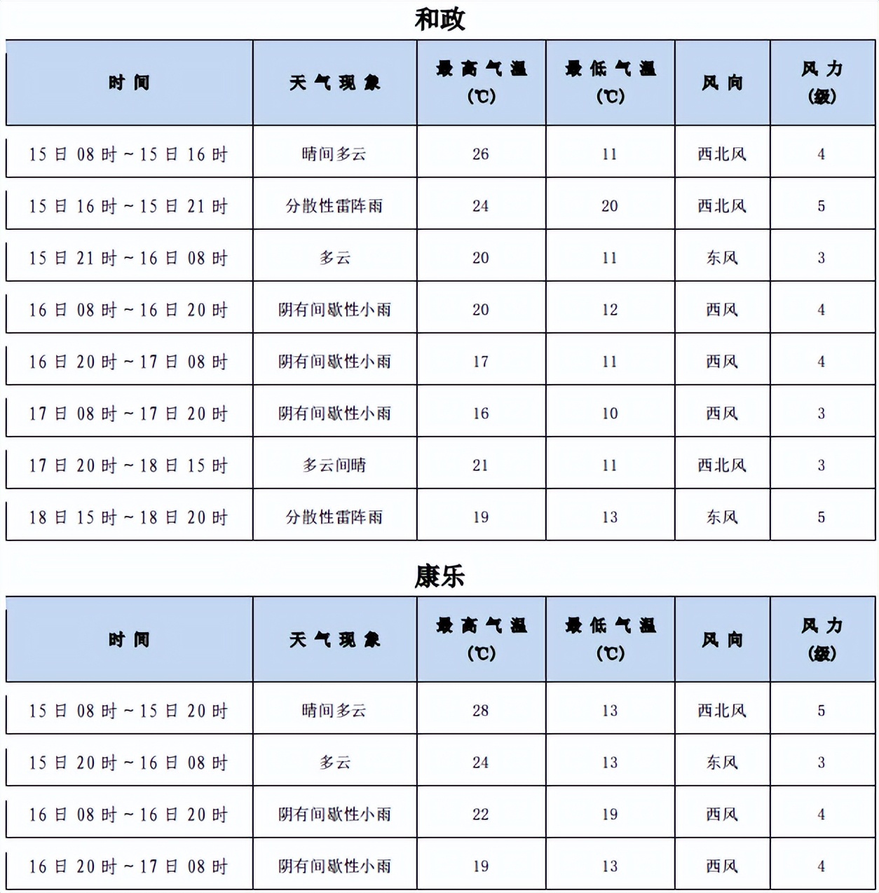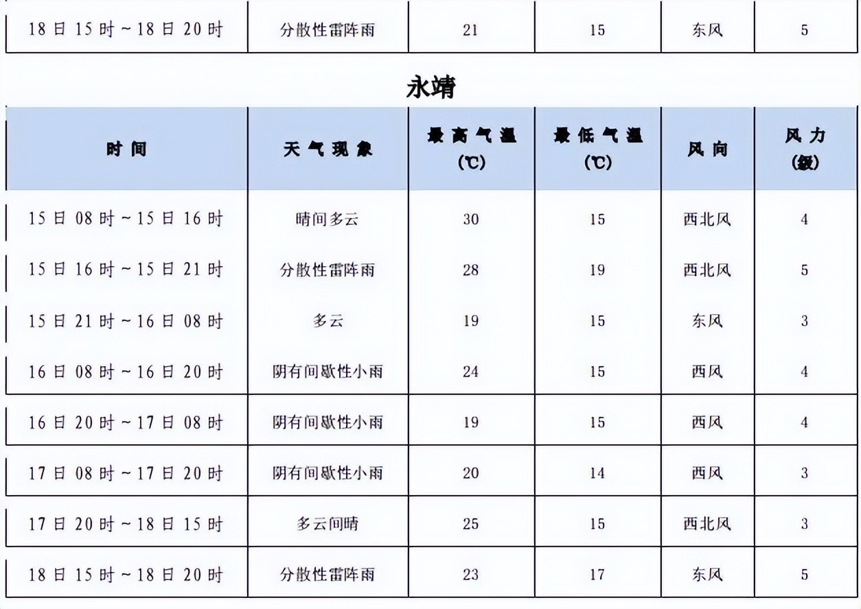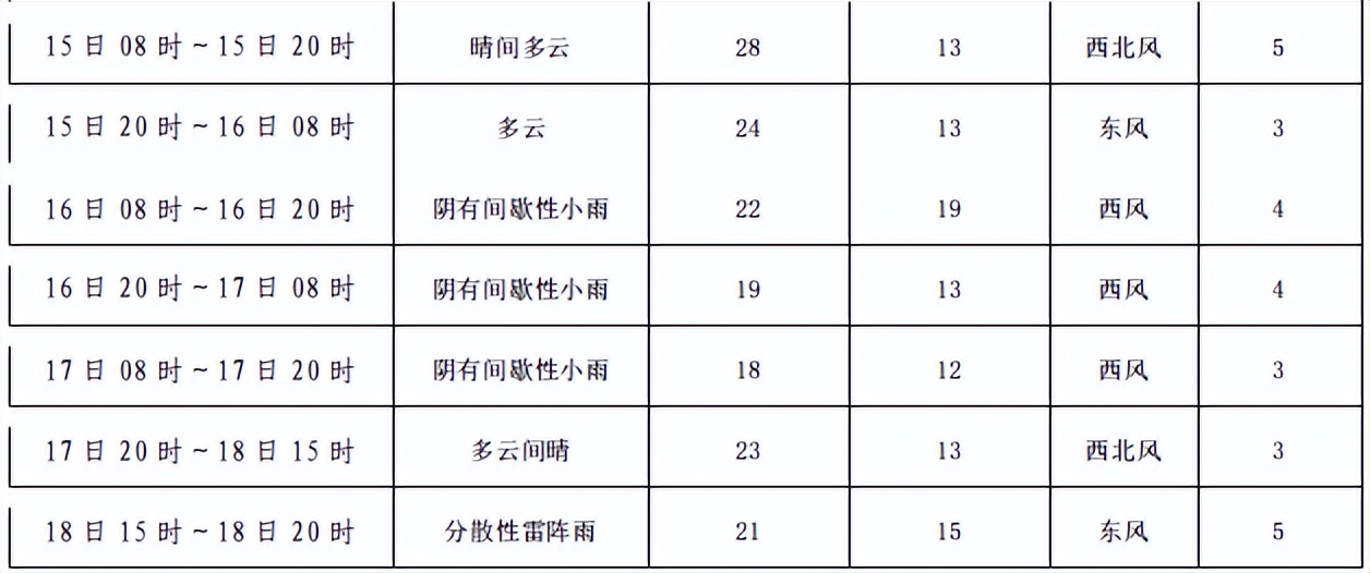 2023年中考期間(6月16~18日)天氣預報:15日08:00~16:00全州晴間多云,氣溫13℃~28℃;15日16 :00~21:00全州分散性雷陣雨,氣溫24℃~26℃;15日21 :00~16日07:00全州多云,氣溫13℃~24℃;16日07:00~17日20:00全州陰有間歇性小雨,氣溫13℃~24℃;17日 20:00~18日15:00全州晴間多云,氣溫13℃~23℃;18日15 :00~20:00全州分散性雷陣雨,氣溫18℃~22℃。具體預報見下表: