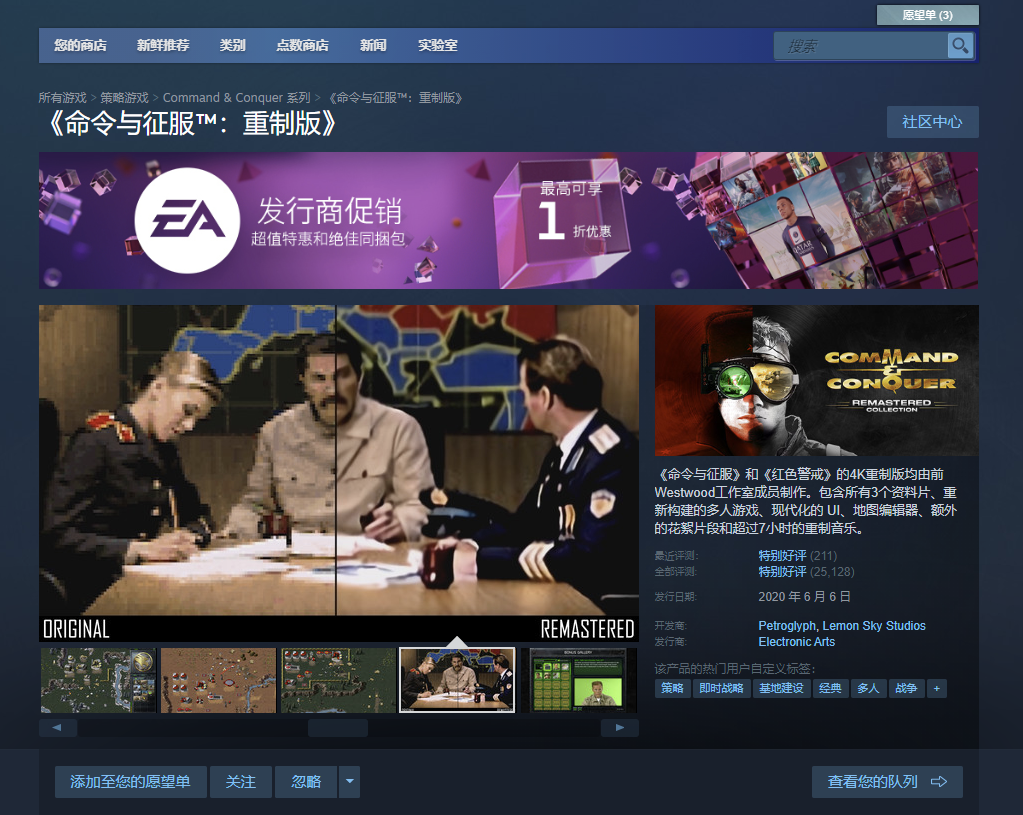 大家進入到steam平臺后,需要前往至搜索欄輸入游戲名字,進入到游戲官方頁面,可以看到命令與征服、紅色警戒為大家準備了雙版本顯示,4K與經典版可以在游戲中來回切換。