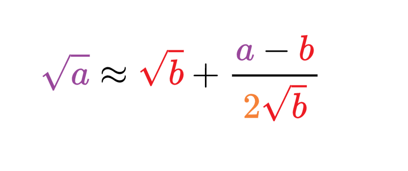 比如現在計算要對a進行開平方(原諒我用這種表述,主要是編輯公式太麻煩[呲牙]),找到和a最接近的平方數,記這個平方數為b,然后按照下面的公式計算即可。如果大家找到的平方數和要開方的數不是最接近的,也可以用這個方法計算,只是精度要差一些。