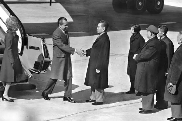 1972年2月21日上午11點30分,美國總統尼克松乘坐的“空軍一號”飛機降落在北京機場。艙門開啟,尼克松快步走下舷梯,向前來迎接的中國總理周恩來伸出右手。周恩來說,你的手是伸過世界最遼闊的海洋來和我握手。