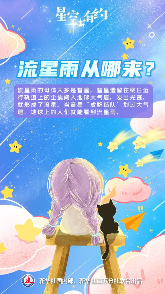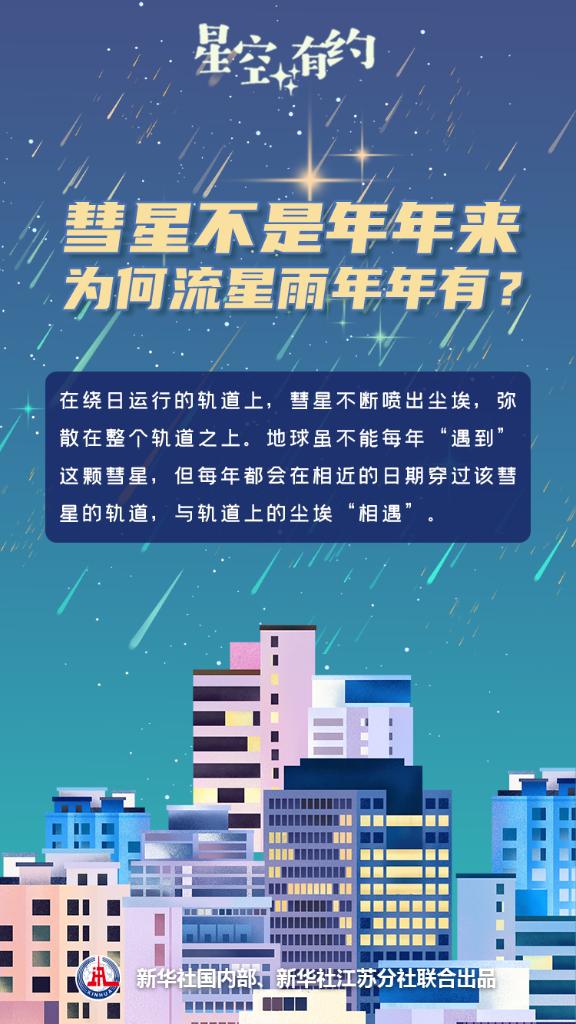 中國科學院紫金山天文臺科普主管王科超說,要解釋這個問題,首先得講到流星雨產生的原因。流星雨的母體大多是彗星。彗星遺留在繞日運行軌道上的塵埃闖入地球大氣層,發出光跡,就形成了流星。當流星“成群結隊”劃過大氣層,地球上的人們就能看到流星雨。