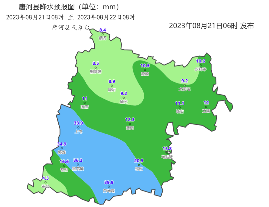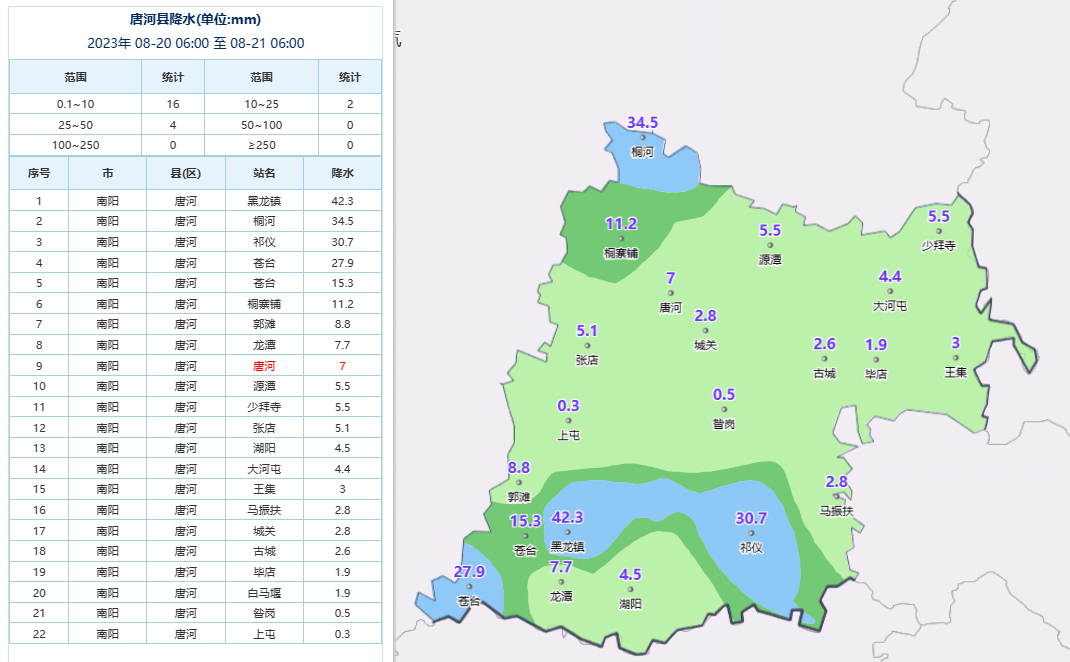 8月20日06時-8月21日06時唐河縣降水實況圖