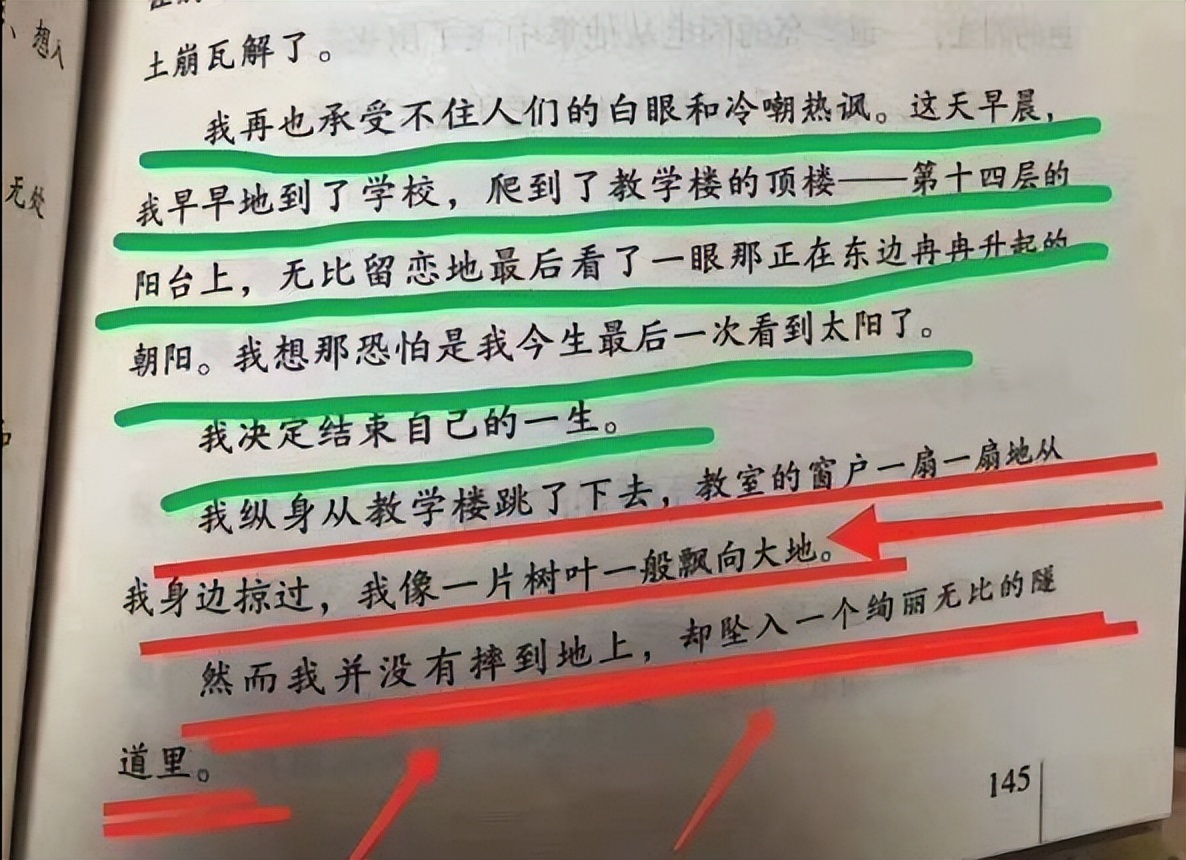 但是其中有一段文字卻引發眾人的質疑,這段心理描寫似乎有宣揚自殺的嫌疑,非常不適合兒童觀看。