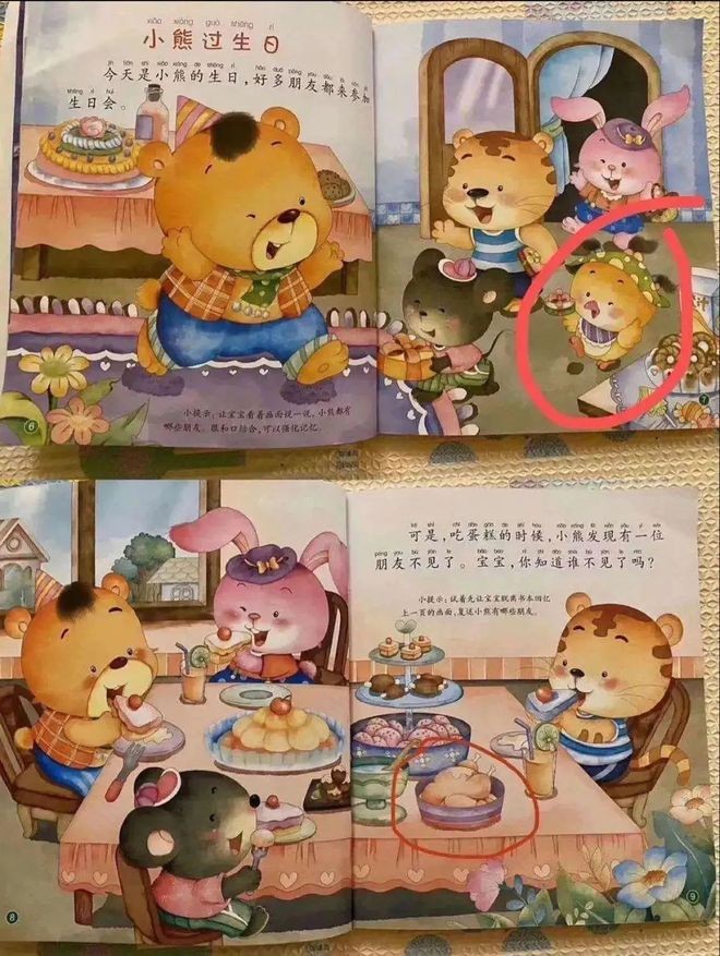 繪本中還問了一句:“寶寶,你知道誰不見了嗎?”而文字下面的餐桌上,赫然擺了一個烹飪過的燒雞。