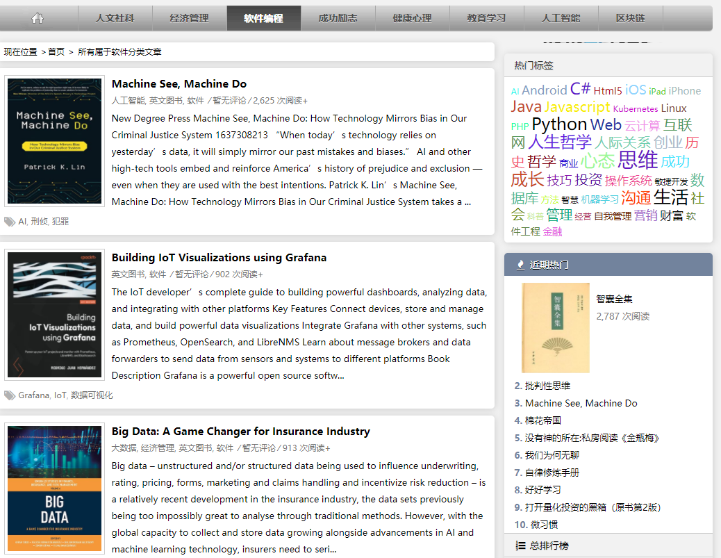 在我看來,這個算是程序員必備的網站了。提供的書籍包括:AI、Android、C、Html5、Java、Javascript、云計算、數據庫、哲學、商業、成長等相關的電子書籍,學習程序編碼的朋友可以在這里找到入門書籍以及學習資源。