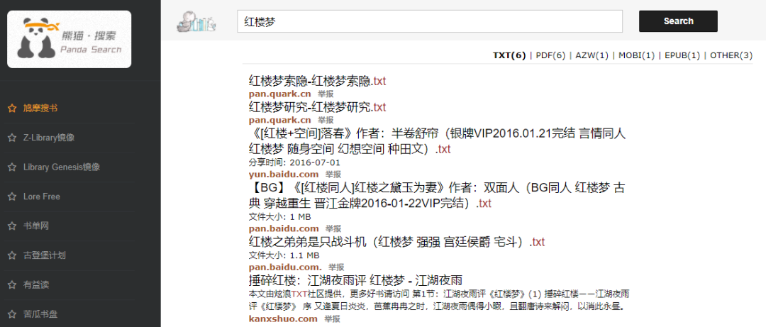 熊貓搜書不僅本身是一個搜書網站,同時更是一個整合了眾多搜書引擎的聚合類搜書網站,可以說是一個電子書搜索引擎導航網站,匯集了鳩摩搜書、書單網等多個網站,使用者通過熊貓搜書一個平臺既可以搜索到不同網站的資源,便捷又高效。