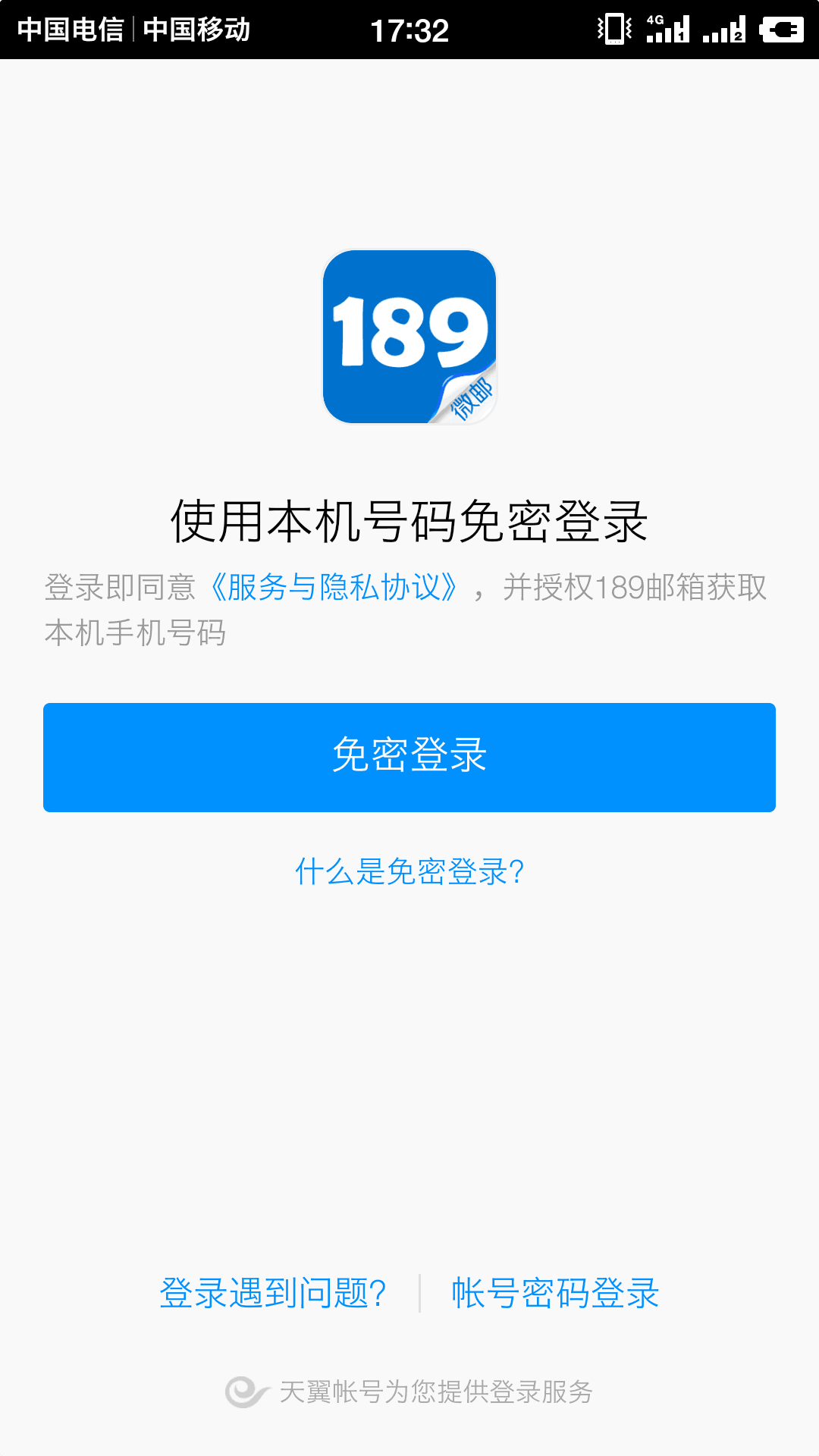 本機免密直接登錄是天翼賬號首創的快捷、安全登錄方式,是運用電信運營商獨有的網絡認證能力,通過手機網絡認證用戶手機號碼,登錄時免除輸入密碼操作,同時確保賬號在本機上登錄,不會被他人盜用。而且很多App都可以使用天翼賬號免密登錄,免去了申請多個App賬號的繁瑣,實行了一號通行。比如、微博、天翼云、189郵箱等App都可以使用天翼賬號免密登錄,既安全方便又快捷省時,真正做到了解決客戶的煩惱。