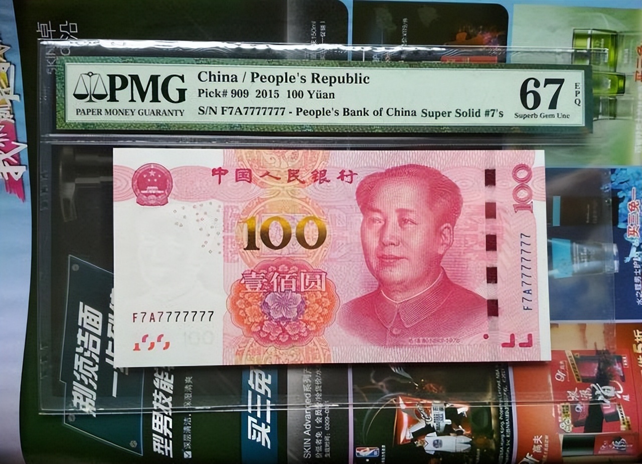 我們今天要介紹的,不是1999年版的紙幣,這是一張2015年的土豪金100元紙幣,這張100元紙幣的收藏價格達到了13500元,之所以它的收藏價格能夠上漲這么多,是因為這是一張八同麒麟號紙幣,并且這是一張fa首發冠紙幣,還是一張67分的評級幣,所以他的收藏價格才能夠上漲這么多。