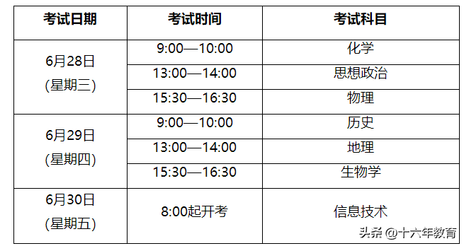 - 政治、歷史、地理、物理、化學、生物科目合格性考試采用筆試方式,時間均為60分鐘;其中,物理、化學、生物科目合格性考試另設操作技能考試,時間均為15分鐘。