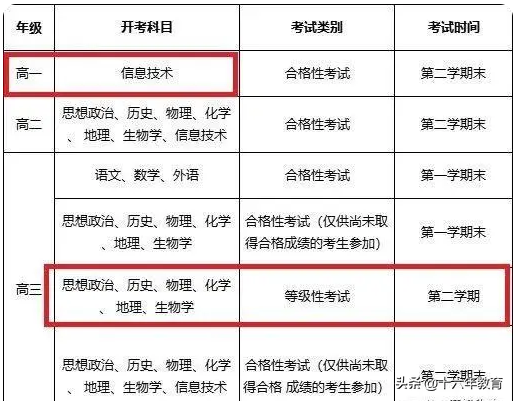 - 政治、歷史、地理、物理、化學、生物科目分設合格性考試和等級性考試。