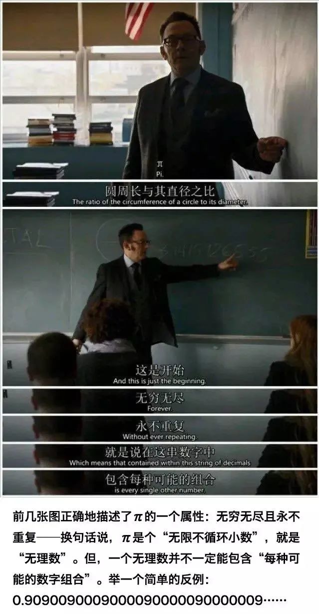 雖然在《疑犯追蹤》里宅總有那個著名的演講,聲稱π包含了一切,也有很多由此衍生而來的段子(不要在你的硬盤上存儲π,因為它侵犯了有史以來所有可能的版權,包含了全世界所有國家的所有最高機密,等等),但這一點并沒有得到數學上的證明。再強調一遍,沒有證明。我們明確知道π是無限不循環的,僅此而已;剩下的都是猜想。