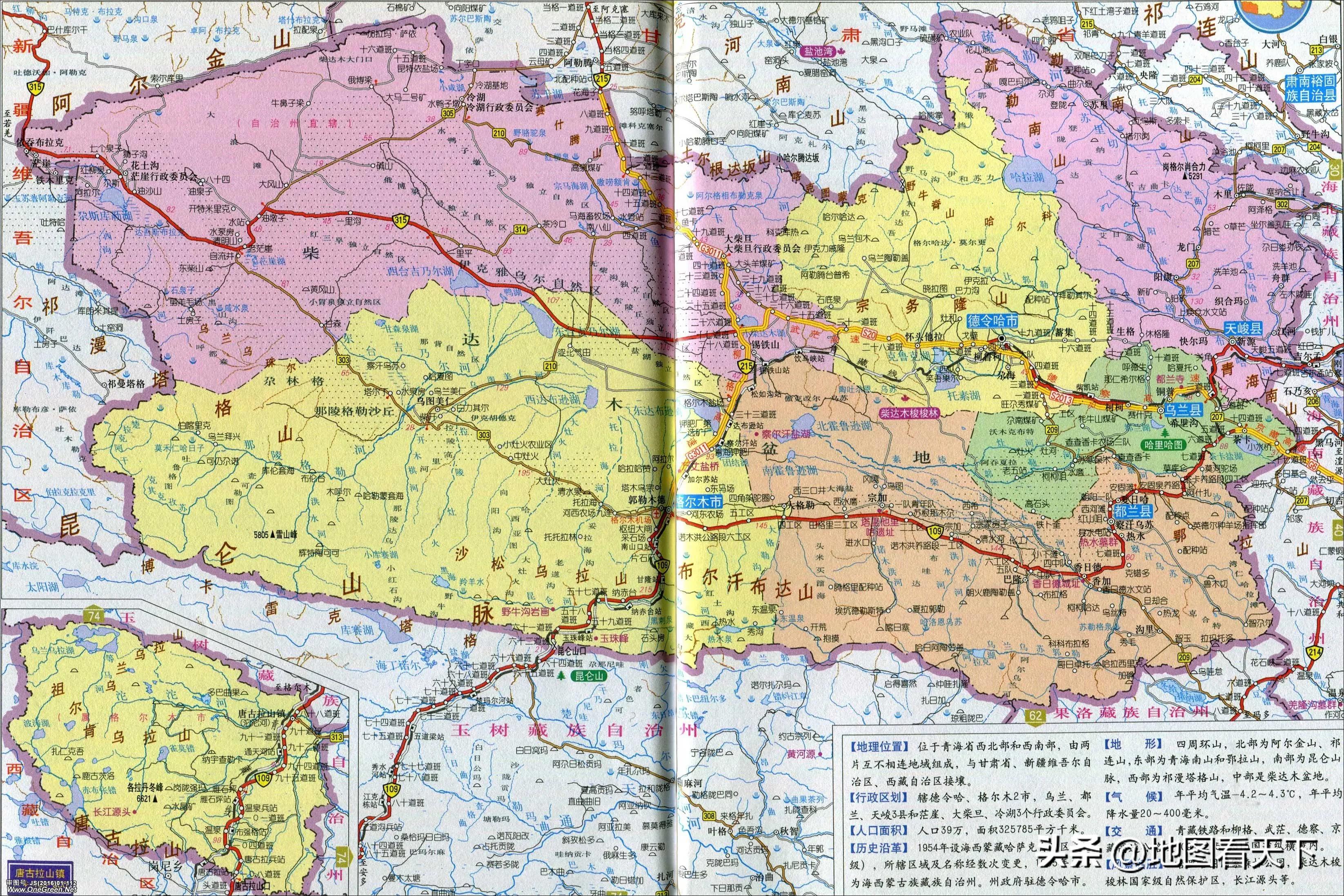 【地理位置】位于青海省西北部和西南部,由兩片互不相連地域組成,與甘肅省、新疆維吾爾自治區、西藏自治區接壤。