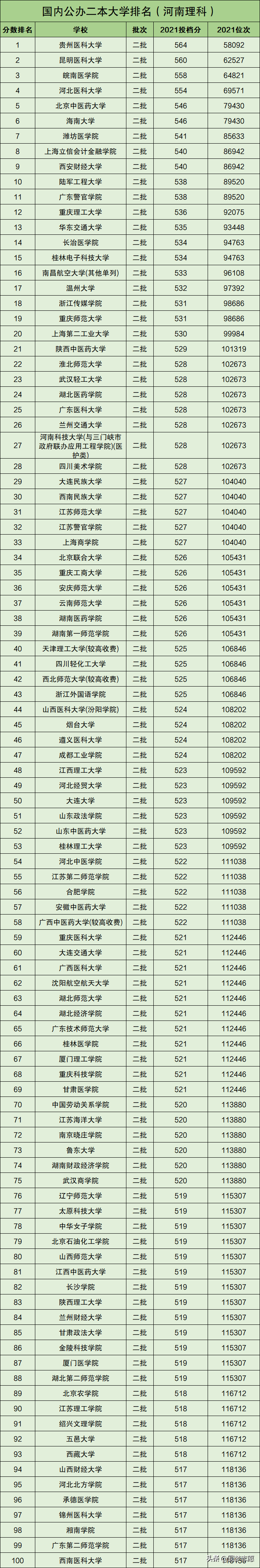 第一,下圖中的學校取自2021年在河南理科本科二批次招生的公辦大學前100強。