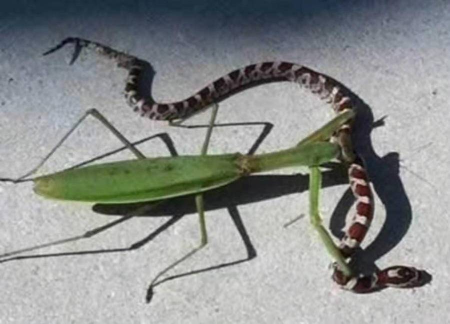 蛇遭到反復攻擊,多處受傷,看看已無勝算,瞅個空兒脫離螳螂糾纏,快速逃往遠處。精疲力盡的螳螂也不追趕,靜靜地趴在原地歇息。