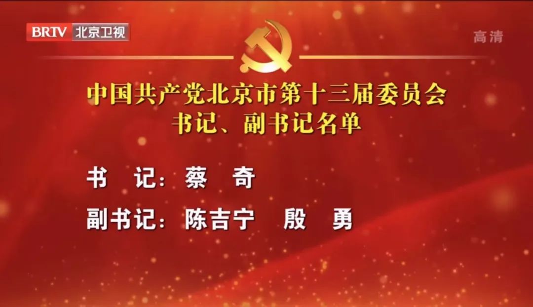中共北京市第十三屆委員會第一次全體會議6月30日選舉蔡奇為市委書記,陳吉寧、殷勇為市委副書記,當選為市委常委的還有游鈞、孫梅君(女)、陳健、莫高義、夏林茂、付文化、楊晉柏、靳偉、孫軍民(女)、趙磊。
