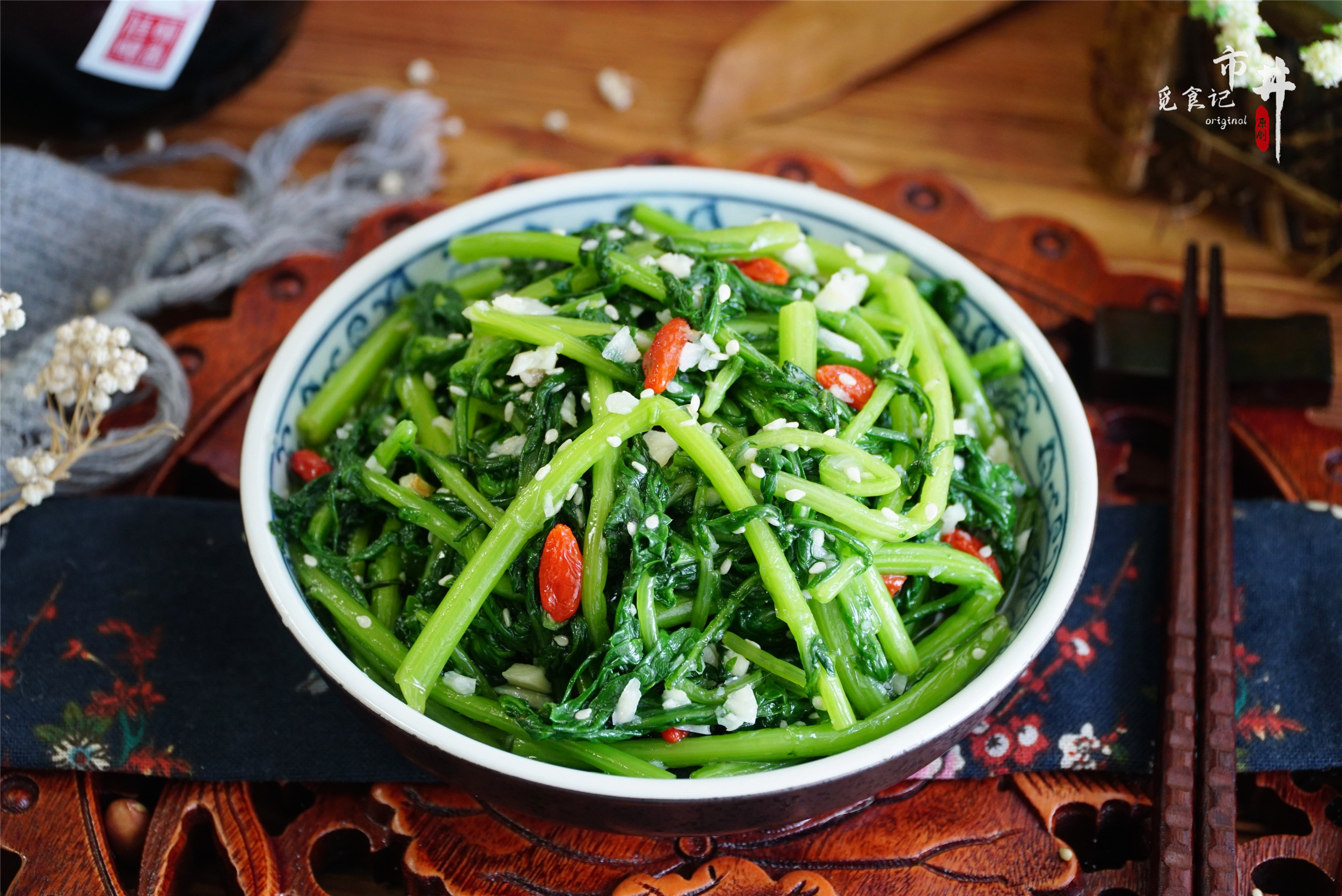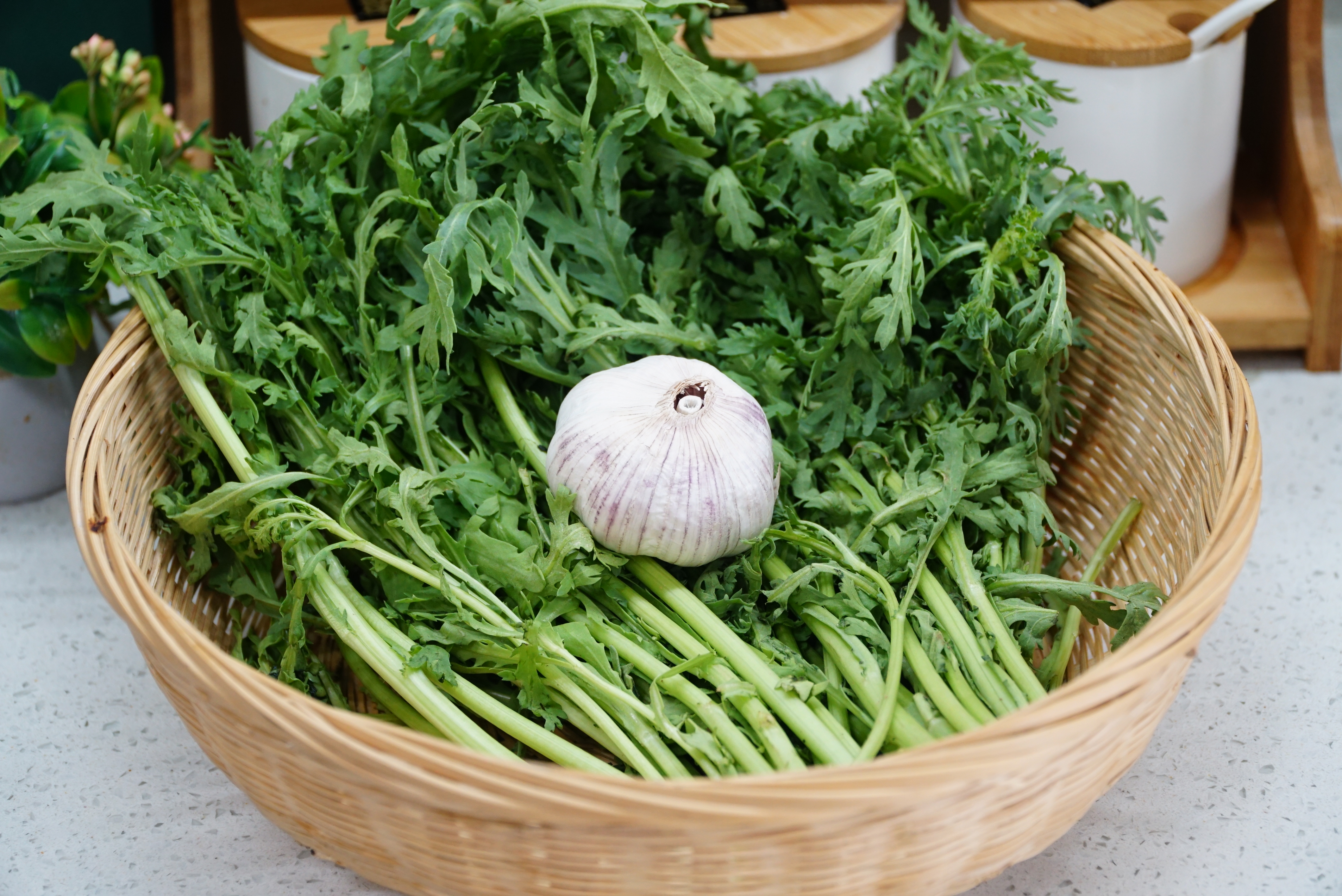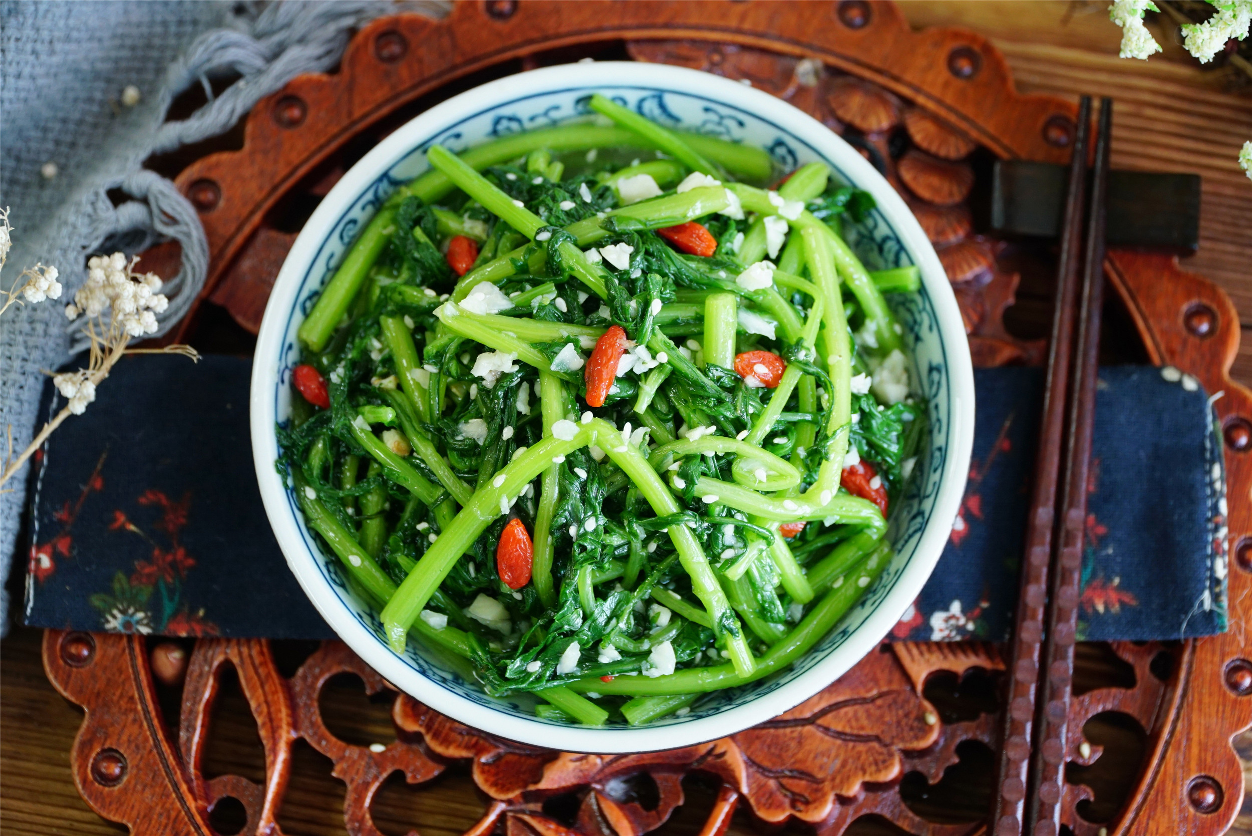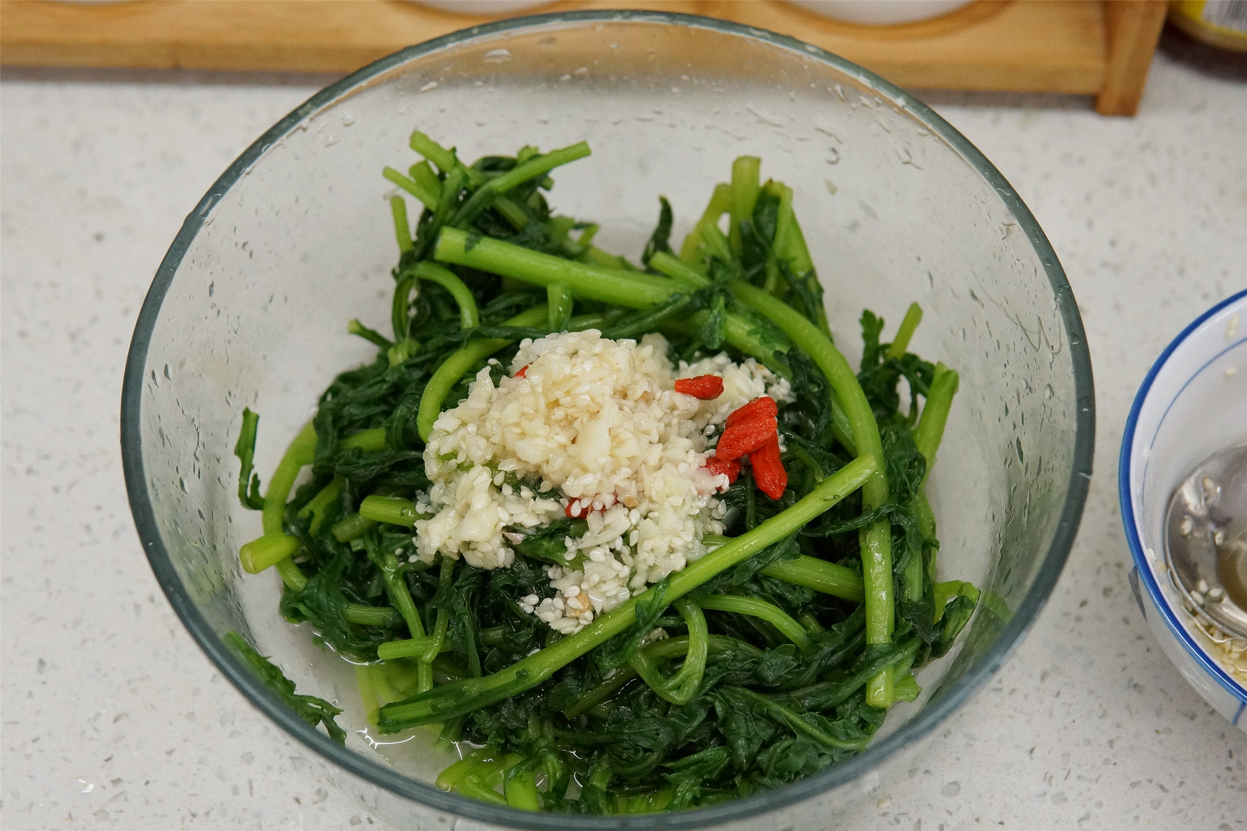 所需食材:茼蒿1把、大蒜1頭、白糖小半勺、香油1勺、白芝麻1勺、枸杞1把、蘋果醋1勺、適量的鹽和雞精。
