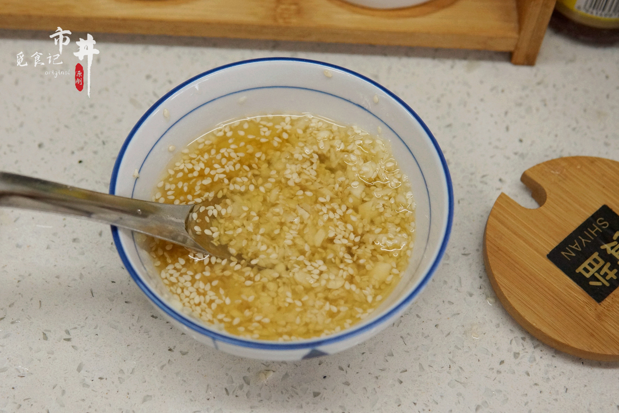3、碗中加入切好的蒜蓉、1勺芝麻,澆上一勺熱油攪拌均勻,使碗中的食材都能與熱油充分接觸,繼續加入1勺香油、1勺蘋果醋、小半勺白糖、適量的鹽和雞精,攪拌均勻制成料汁。如果家里沒有蘋果醋,可以加入少量的陳醋。