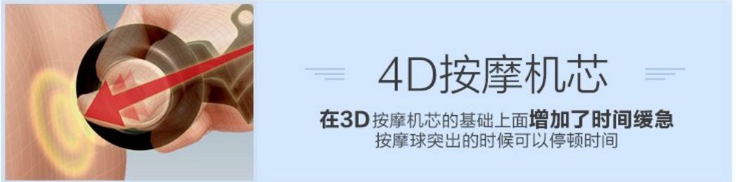 按摩椅上的4D指的是調速。比如控制按摩頭按壓走過肌肉的速度,加大該部位的按摩效果,在經過某個部位時機芯按摩停留的時間緩急也就改變了,從而改變了某個按摩部位承受的按摩力度,在一些特別酸脹的常見位置甚至會停留下來,讓按摩體驗感更好。