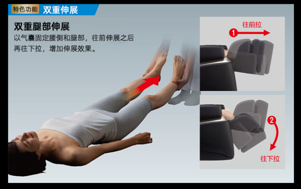 還有頸部伸展、背部伸展、腰部伸展3種拉伸技巧,使用氣囊和按摩球固定身體,再拉伸腳部時對各個部位進行較強的伸展。全身還有一個擺動伸展功能,以氣囊固定身體,椅背與腿部同時上下擺動伸展全身。