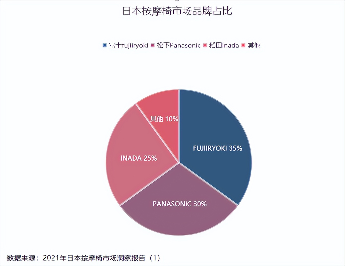 日本按摩椅市場經過幾十年的發展,核心品牌主要集中在FUJIIRYOKI富士、PANASONIC松下、INADA稻田這三家,這三個品牌占有率相差不大,其他的按摩椅瓜分一小塊蛋糕。