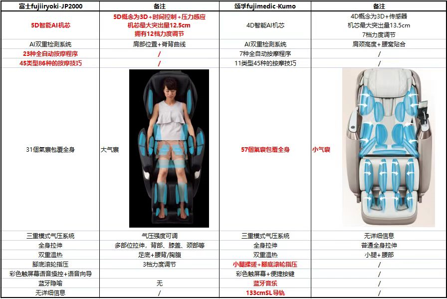 FUJIIRYOKI(真.富士按摩椅)的JP2000和FUJIMEDIC(被奧佳華收購的廈門富士麥迪克)的KUMO,一個叫富士醫療器,一個叫日本富士,來看下除了生產標準的不同,兩家旗艦有啥其他區別。