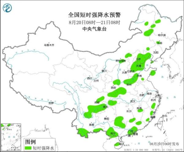 預計8月20日08時至21日08時,內蒙古中東部、黑龍江西部、陜西北部、山西北部、河北北部、河南北部等地的部分地區將有8-10級雷暴大風或冰雹天氣;內蒙古東部和中南部、黑龍江西部、吉林西部和中部、遼寧西部、陜西中南部、山西北部、河北中北部、北京東部、天津、山東中西部和東部、河南北部和西部、湖北北部和西南部、湖南南部、江西中南部、浙江南部、福建東部、四川中東部、重慶中西部和東北部、云南南部和西北部、廣西南部和東北部、廣東北部和中部、海南島西北部等地的部分地區將有短時強降水天氣,最大小時雨量30-50毫米,局地可達60毫米以上。