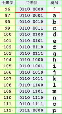 比如英文字母 A 對應二進制 0110 0001 ,英文字母 B 對應 0110 0010 等等。