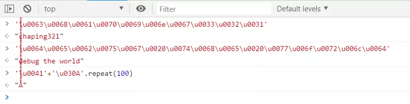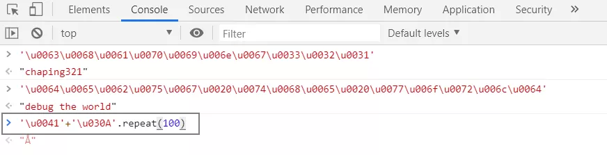 首先我們輸入字母 A( u0041 ) ,然后輸入組合字符圓圈 ? ( u030A ),接著將圓圈重復 100 個( repeat( 100 ) )。
