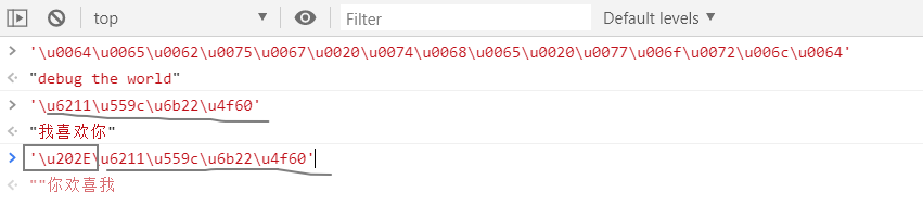 第二行翻譯過來是 “ 我喜歡你 ” ,我們在開頭加一個 RLO ( U202E ),可以看到文字變成了 “ 你歡喜我 ” 。