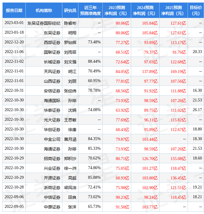 證券之星數據中心根據近三年發布的研報數據計算,長城證券劉文強研究員團隊對該股研究較為深入,近三年預測準確度均值高達88.44%,其預測2023年度歸屬凈利潤為盈利72.64億,根據現價換算的預測PE為16.6。