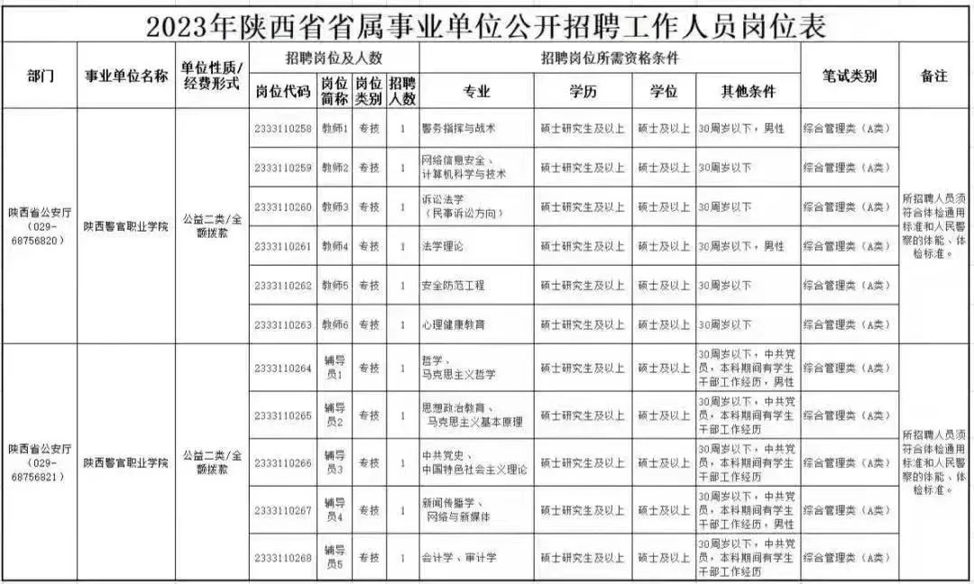 根據《事業單位人事管理條例》、《陜西省事業單位公開招聘工作人員實施辦法》及相關規定,2023年面向社會為省屬事業單位統一公開招聘937名工作人員(含中央駐陜事業單位42人)。其中,陜西警官職業學院2023年公開招聘11名工作人員(6名教師、5名輔導員)。招聘崗位及人數如下: