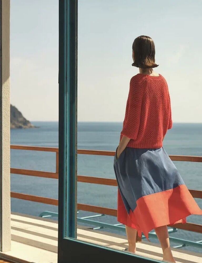 一條火紅色的A字半裙,華麗明媚的顏色在干凈剪裁上顯得一點都不浮夸,那份文藝淑女的情調恰好可以與藏藍色的T恤融合成一套具有儀式感的都市風著裝,簡約大氣,沉靜優雅,時尚感一流▼