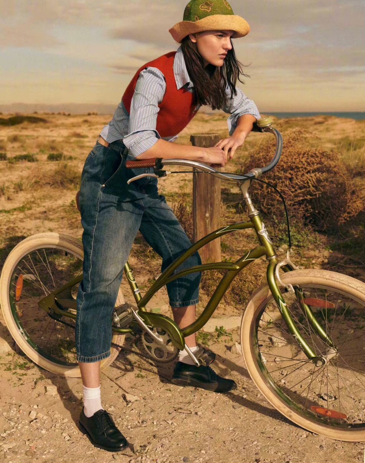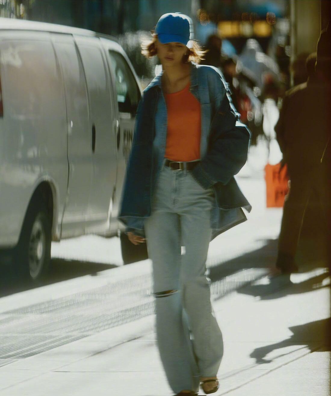 一件大紅色的硬朗夾克外套屬于瞬間就奪人眼球的單品,如果用太濃郁的藍色來配它,反而會顯得有些喧賓奪主。