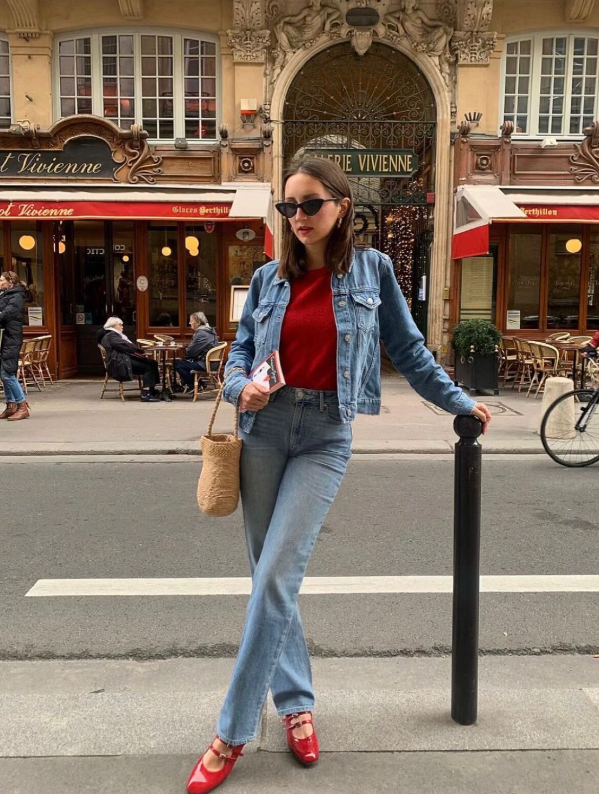 很喜歡Marielle的這套穿搭:中藍色的單寧牛仔套裝,內搭紅色T恤和瑪麗珍單鞋,瞬間就有種明亮輕快的感覺。