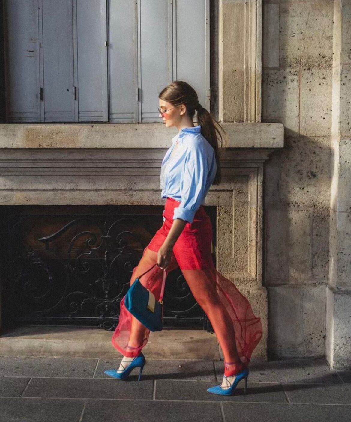 白色、藍色與紅色就更是一組不用考慮就可以穿的很時髦的顏色。不管是白色裹胸上衣還是白色胸衣或者是碎花襯衫,只要是露膚面積比較大,質感很薄透的上衣,都能搭配九分藍色牛仔褲來化解過剩女人味,將性感嫵媚掌控在分寸之間,下配一雙紅色瑪麗珍鞋單鞋,就是優雅復古的法式風格。