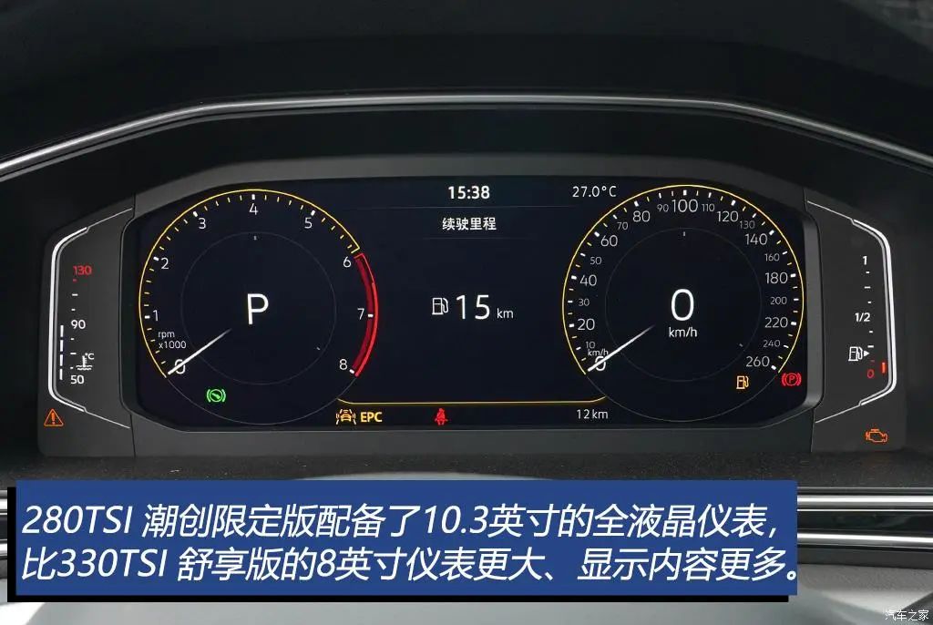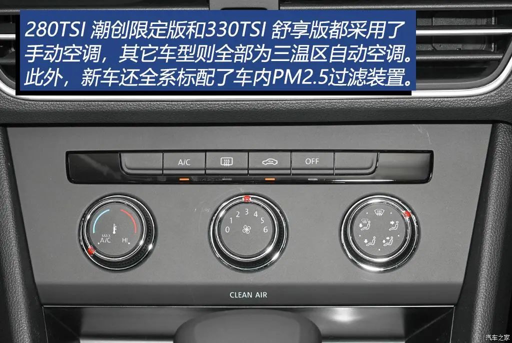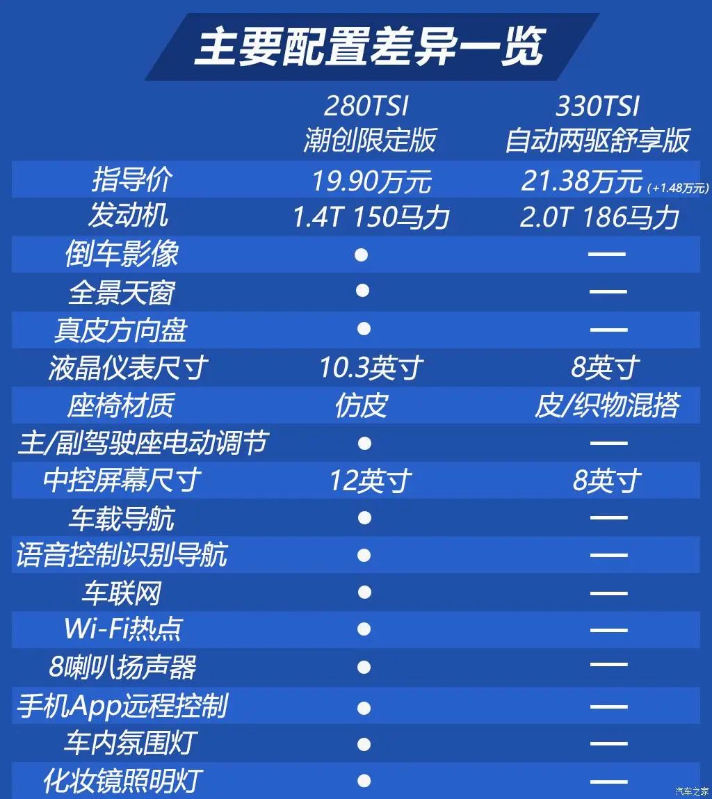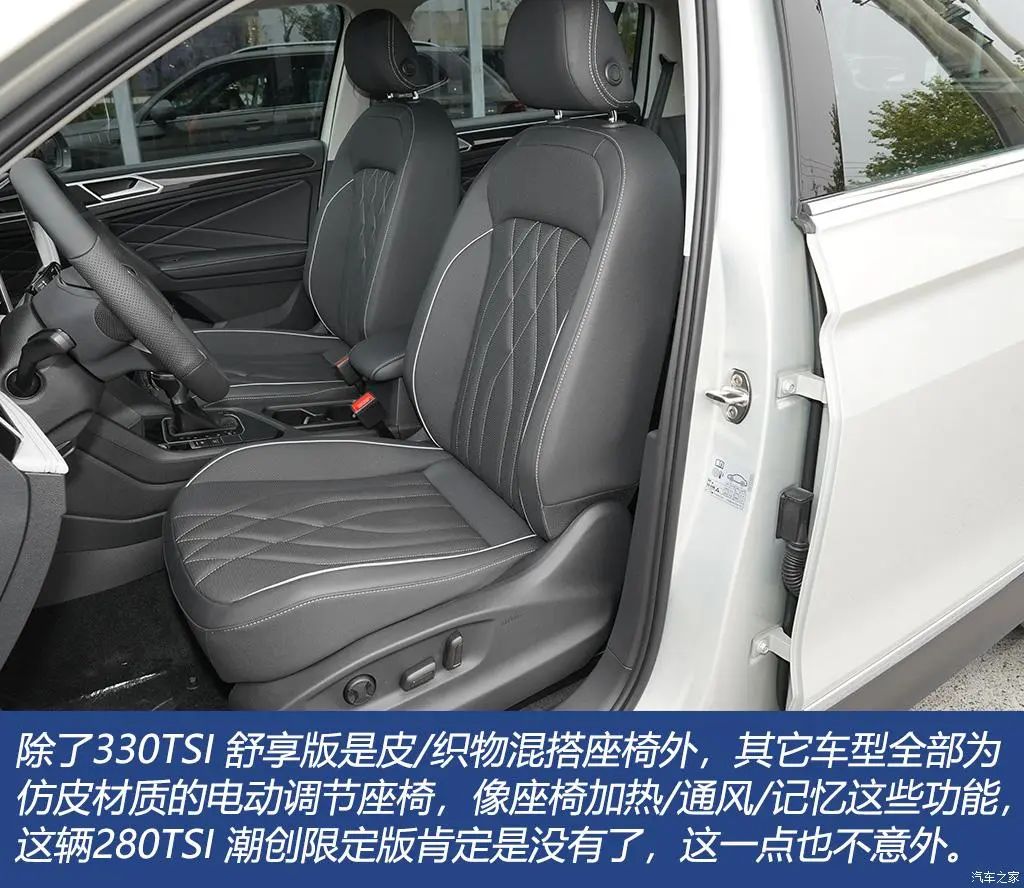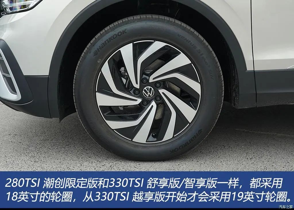 最后反過頭來看280TSI 潮創限定版的配置表現,外觀上配備了LED大燈組、18英寸輪圈,并不顯得“寒酸”,與車身不同色的下包圍/側裙看著也還可以,黑色也顯得硬朗一些。