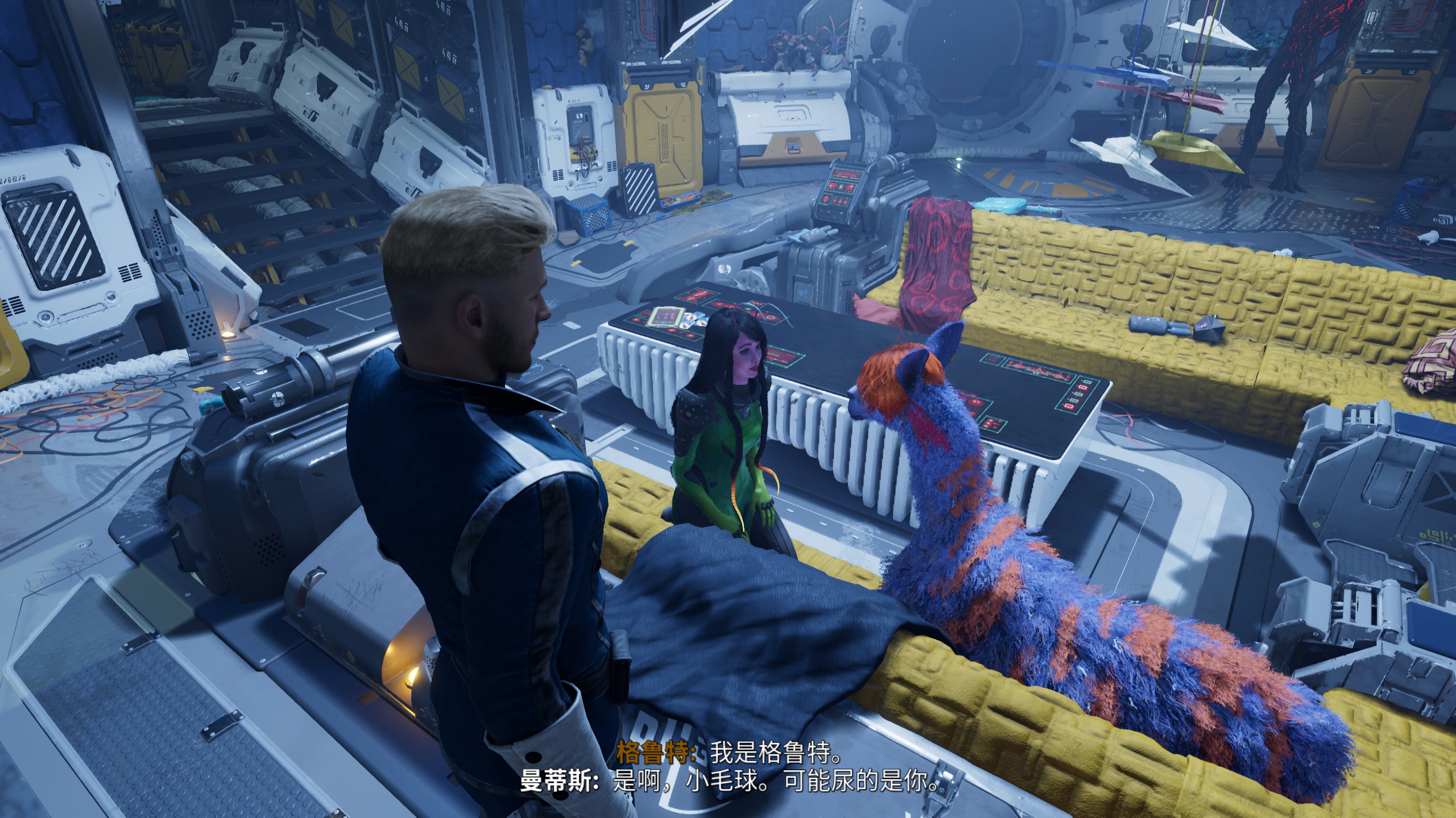 惡搞的內容還包括了船上的吉祥物——序章帶回來的太空羊駝和蟲女曼提斯——可不要小看她,這是天神族的神母,她后續還有著用“點穴”制服德拉克斯的精彩表現。