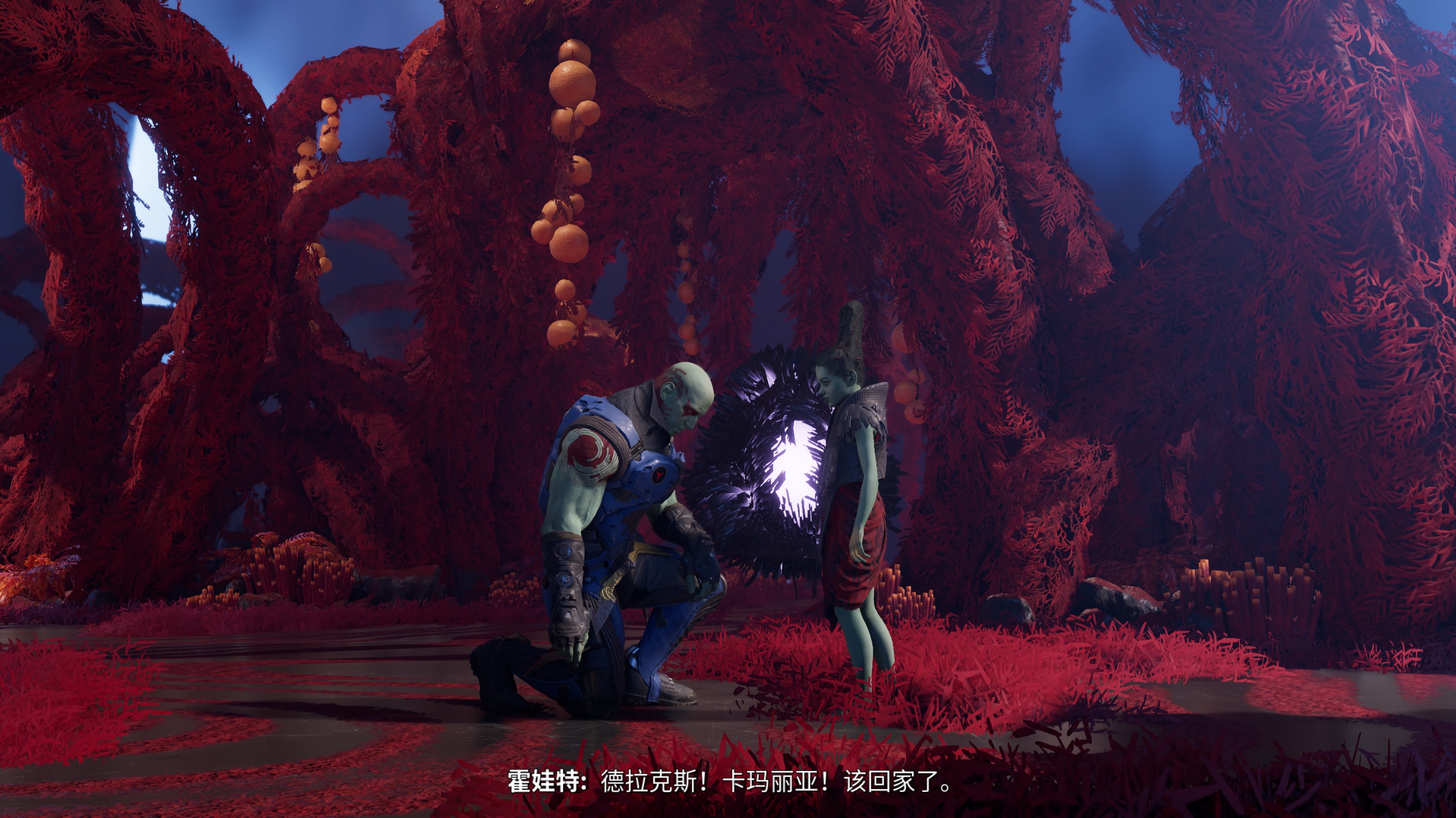 游戲的部分造景質量是非常高的,比如通往怪物女王城堡的道路,巨大的怪物阿勘蒂在空中游弋,遠處的城堡聳立在云端,漫長的通道用來展示光追效果,逗比的銀河護衛隊在路上一邊行進一邊拌著嘴...
