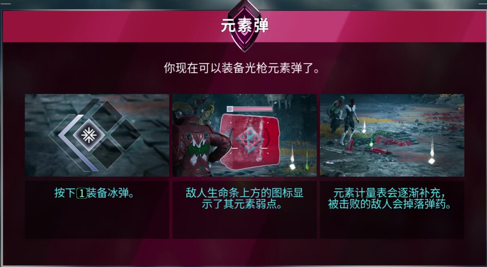 不過星爵常規的射擊也很弱,根據劇情近戰獲得的4種元素彈還不錯,分別是冰彈——單體凍結,雷彈——彈射、麻痹、削韌,風彈——抓取到近身、火彈——只能蓄力發射、持續燃燒傷害。