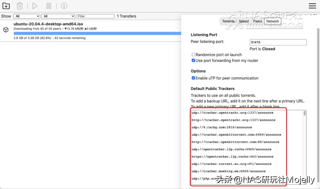 ▲ 關于預設默認trackers功能,著名的Tr Web Control前端暫時還沒有更新,所以暫時無法使用這個新特性,只能切回Transmission 4.0自帶的UI前端,在設置(Edit preferences)→網絡(Network)里進行添加。