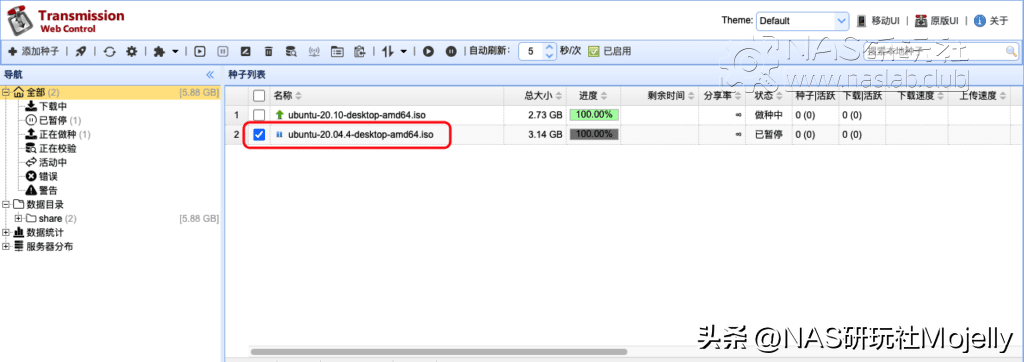 ▲ 新添加任務,下載路徑指向本地已有正確文件的目錄,測試用的Ubuntu 20.04.4的系統鏡像文件,文件大小3.14GB,Transmission 4.0幾秒鐘即從校驗狀態變為“已暫停”,看來官方對于該功能還是相對“保守”,不會直接更改為“正在做種”狀態,后續用戶可以自行選擇開始任務進行做種,還是對任務進行完整校驗。