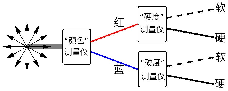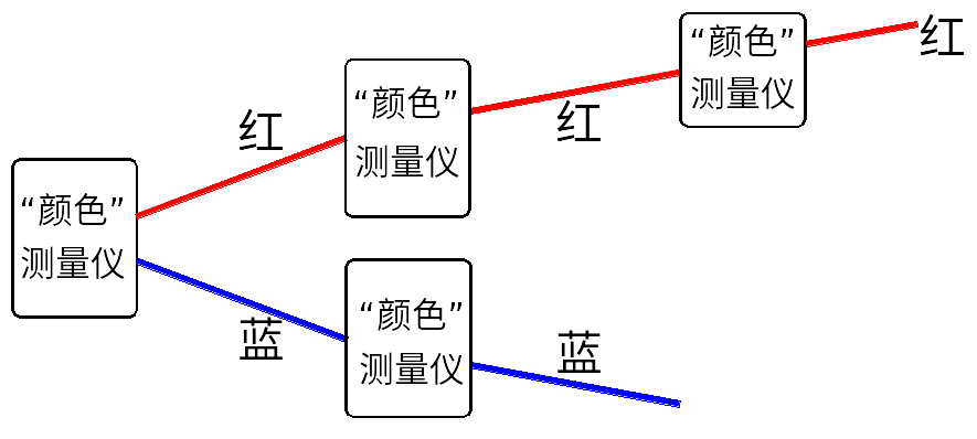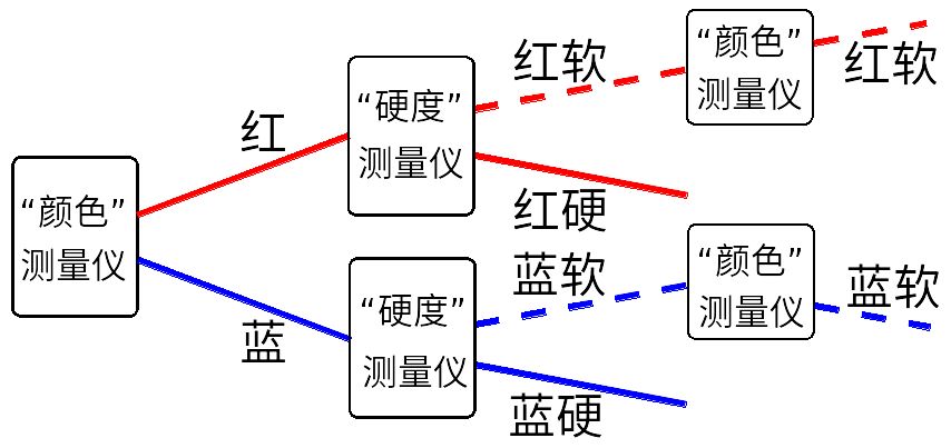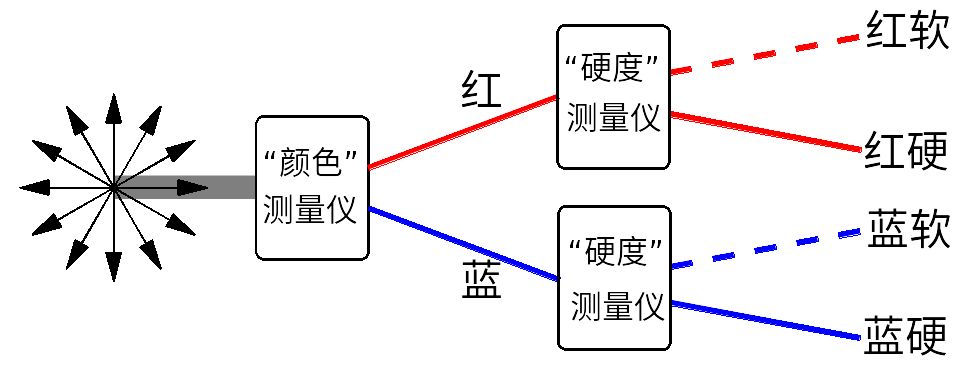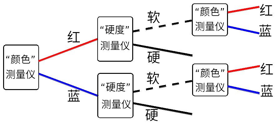 更一般地講,不管進入“硬度”測量儀的電子是處于什么樣的態,經“硬度”測量儀分離出來的軟態總是同一個態,分離出來的硬態也總是同一個態。類似的,不管進入“顏色”測量儀的電子是處于什么樣的態,經“顏色”測量儀分離出來的紅態總是同一個態,分離出來的藍態也總是同一個態。