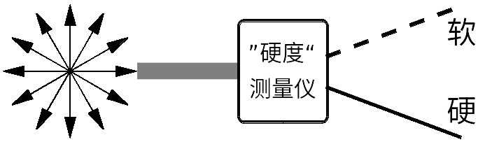 可是 |紅〉態和 |軟〉態就沒有相互排斥的性質。如圖9所示,如果我們測量紅電子的硬度,我們有時候會感到軟,說明 |紅〉態和 |軟〉態不相互排斥;我們有時候也會感到硬,這說明 |紅〉態和 |硬〉態也不相互排斥。類似的,|藍〉態和 |軟〉,|硬〉態也都沒有相互排斥的性質。這種相互不排斥狀態的存在是量子世界中的新現象,是經典理論中沒有的概念。這也是量子理論詭異的起源。