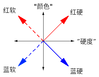 這樣“顏色”可以取兩個值,“硬度”可以取兩個值。那么電子就應該有(至少)四種狀態,根據“顏色”和“硬度”各自的兩種可能的取值 ,我們可以用下面的記號來標記這4個自旋態:|紅軟〉,|藍軟〉,|紅硬〉,|藍硬〉(見圖5)。