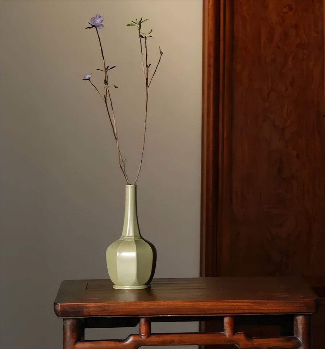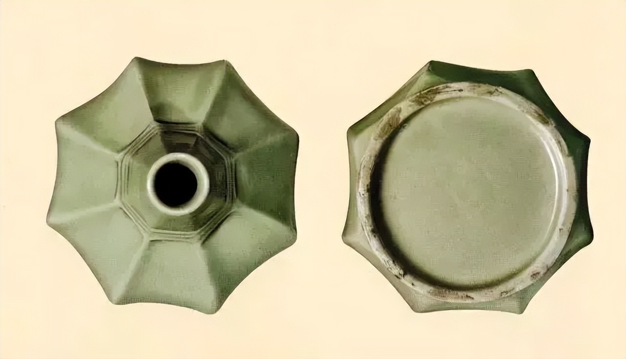 此「秘色越窯八棱瓶」,外形端莊規整,釉色青中泛黃。