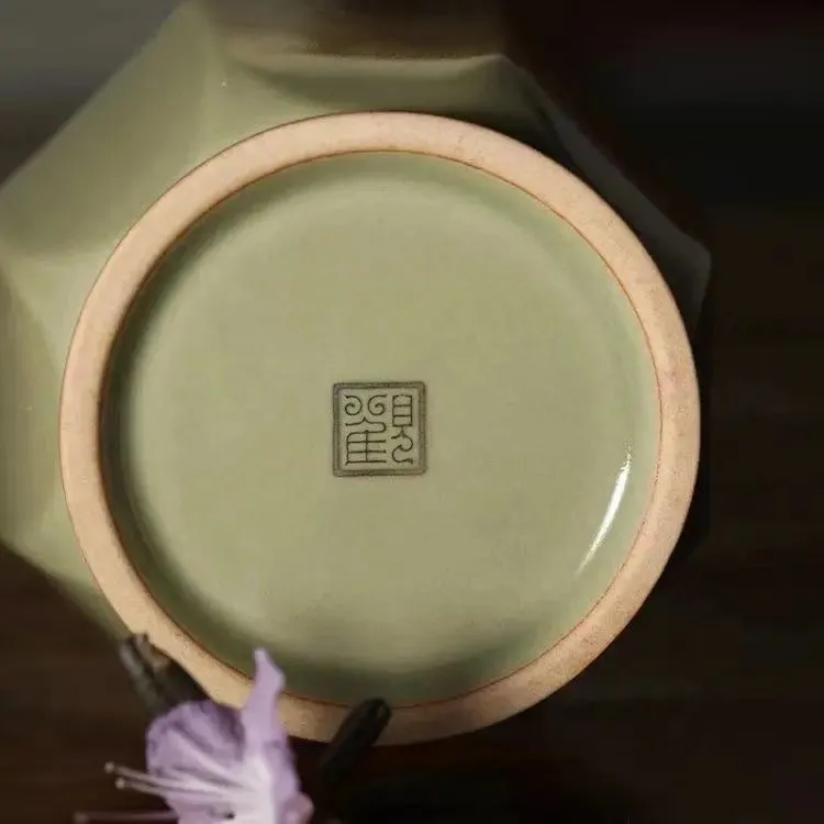 瓶身八棱形,肩部豐挺;腹部漸收,隱有筋骨之感;圈足微外奢,底部鈐印“觀”字款識。