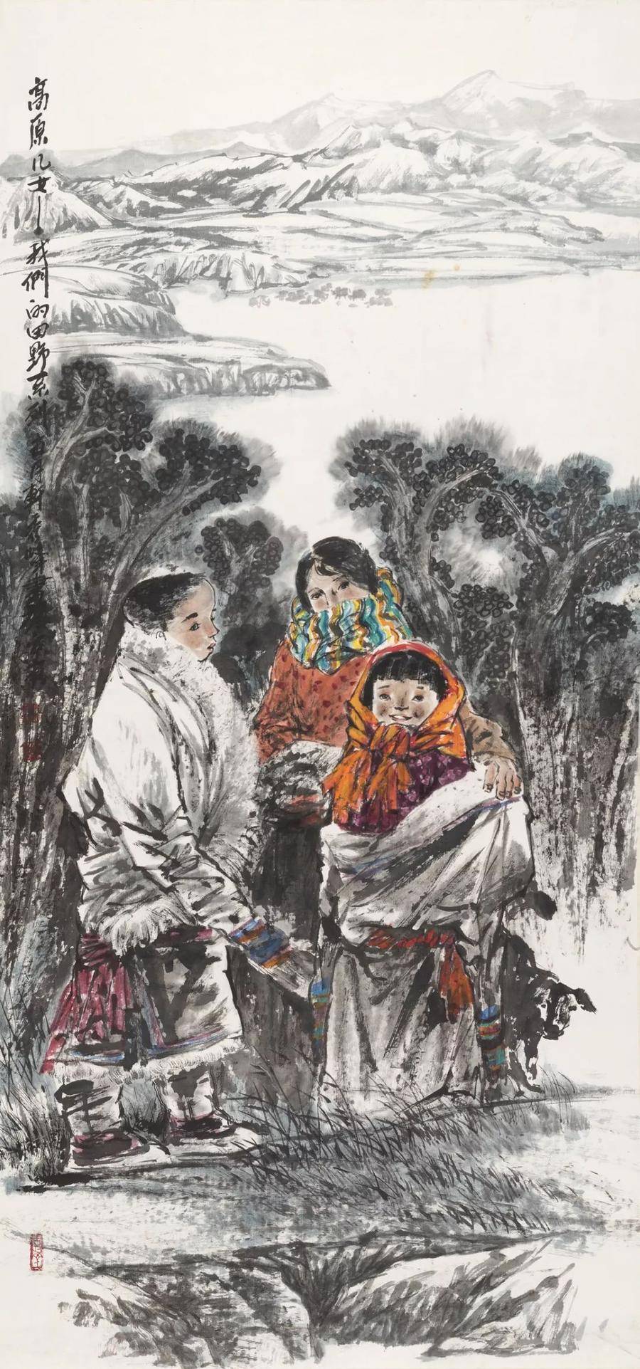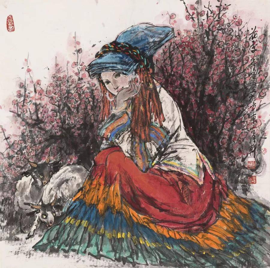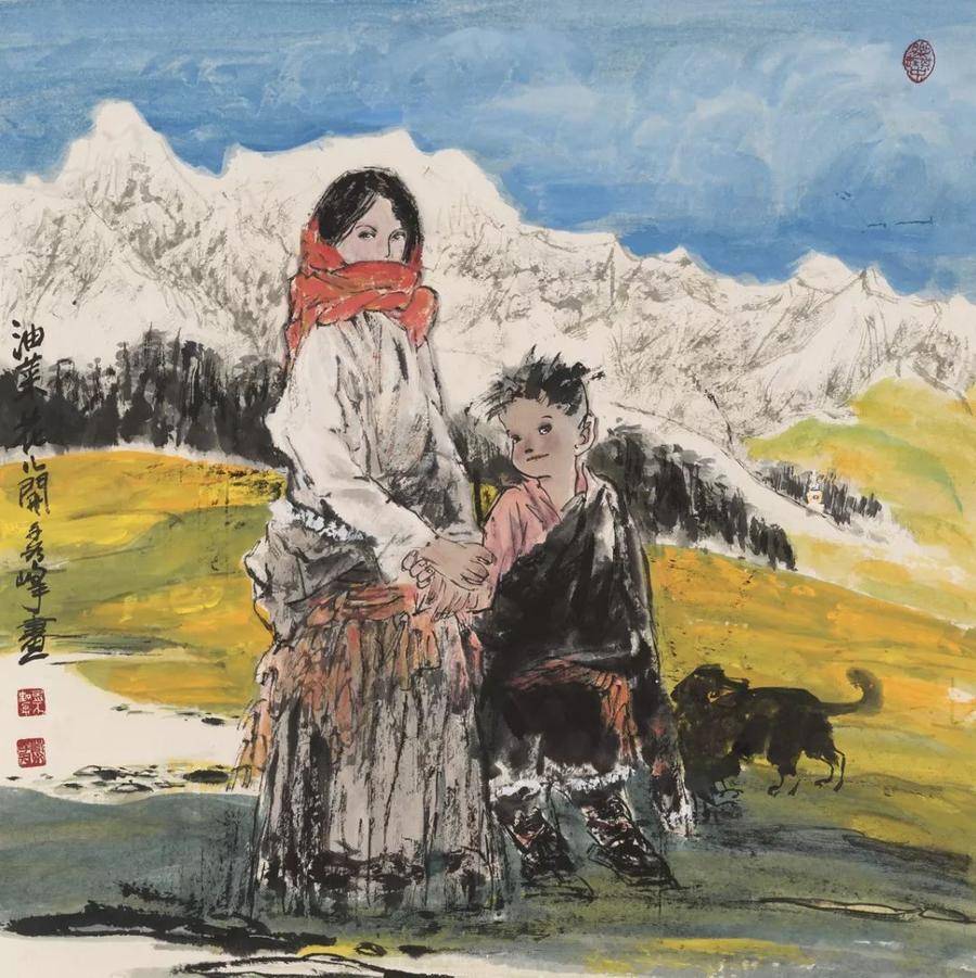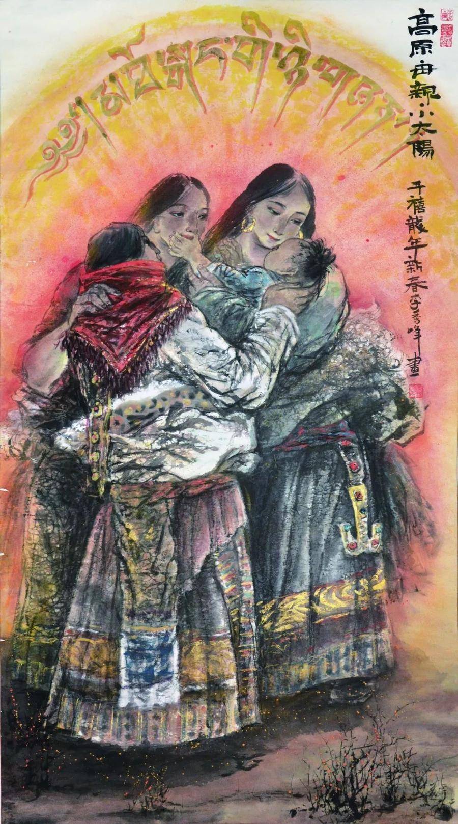 就如這幅6尺大幅的《陽光燦爛的日子》,兩位年經的藏族美女的目光共同聚焦著一位年經母親懷里的孩子,那柔情似水的目光和畫面上從右上方普照下來的陽光一樣地燦爛明媚。雪域高原的圣潔呈現在她們那美麗的臉龐上,她們此時正在逗弄著那個圣嬰般的孩子,在悄悄說著只有她們自己才能明白的私房話。也許她們在為孩子勾畫著明天的希望,也許她們正在由這個孩子而引發了閨蜜間的甜蜜情愫,各自在規劃著自己的幸福。但,她們什么都沒說,或者什么都說了而我們沒聽懂,那么,我們只有用心慢慢地、仔細地去品味、去懷想,去感受這份幸福和安祥!