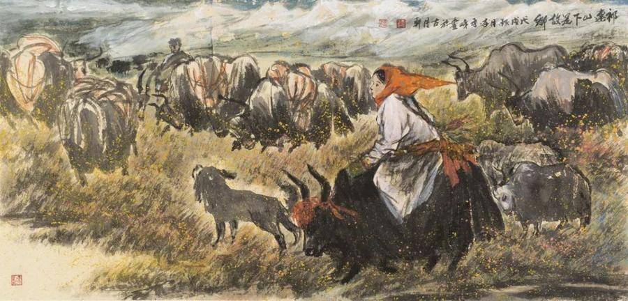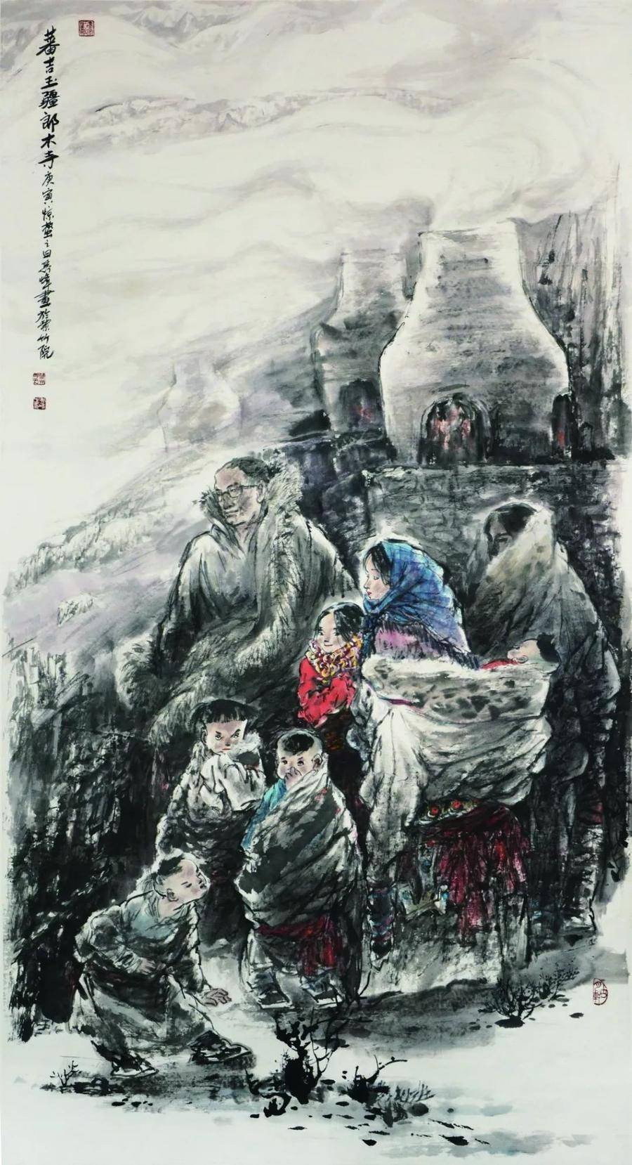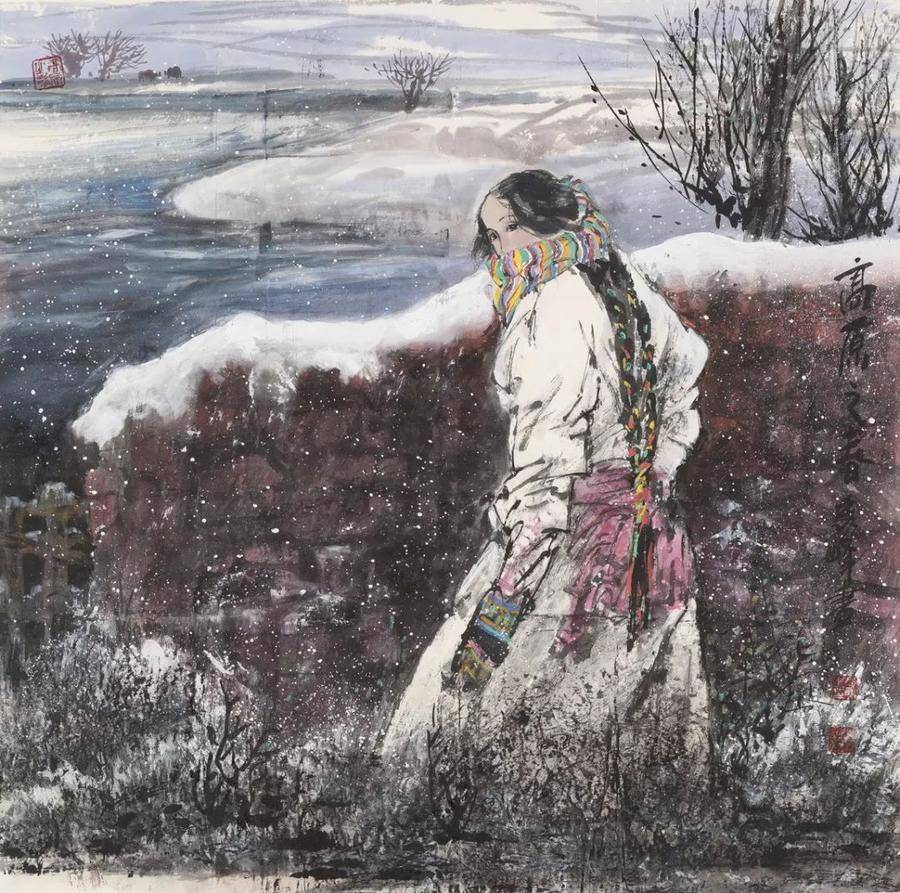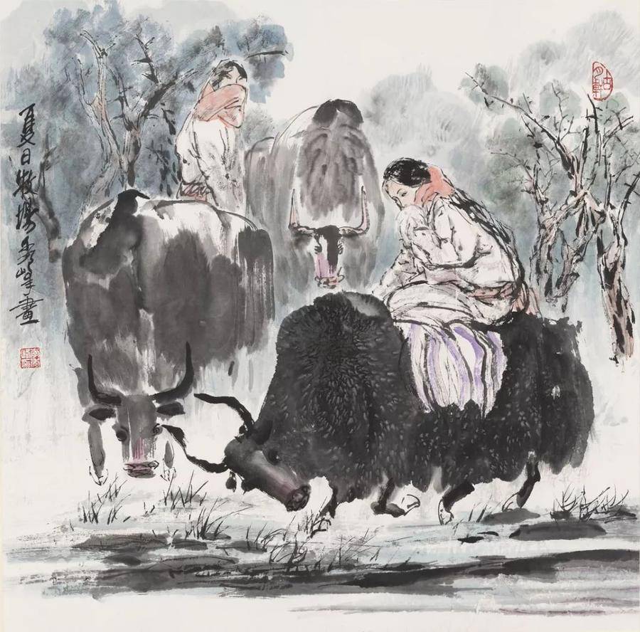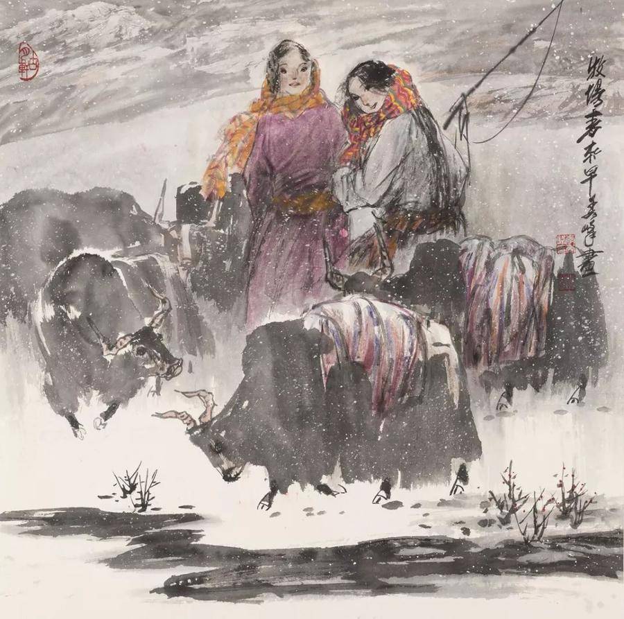 在這幅作品的畫面處理上,大姐采用了強烈的對比手法,首先是色彩上的冷暖對比,抱孩子年經母親身上淡淡的藍色和背景中暖暖的紅色由前置姑娘的一身素白而調合成和諧而又溫馨的色系;其次是畫面右側上方斜躺下來的燦爛陽光和人物背景柴草沉著冷靜的黑白對比;再者便是婦女兒童如蘋果般鮮嫩的臉蛋與婦女身上藏袍的粗放厚重又形成了鮮明對比。大姐把筆墨的干濕濃淡和痛快沉著恰如其分地融和在一起,演奏出筆、墨、水、色的交響樂。而這一切,都是用一個“情”字作統領,使畫面充滿著母子情、姐妹情、西域情、故鄉情。